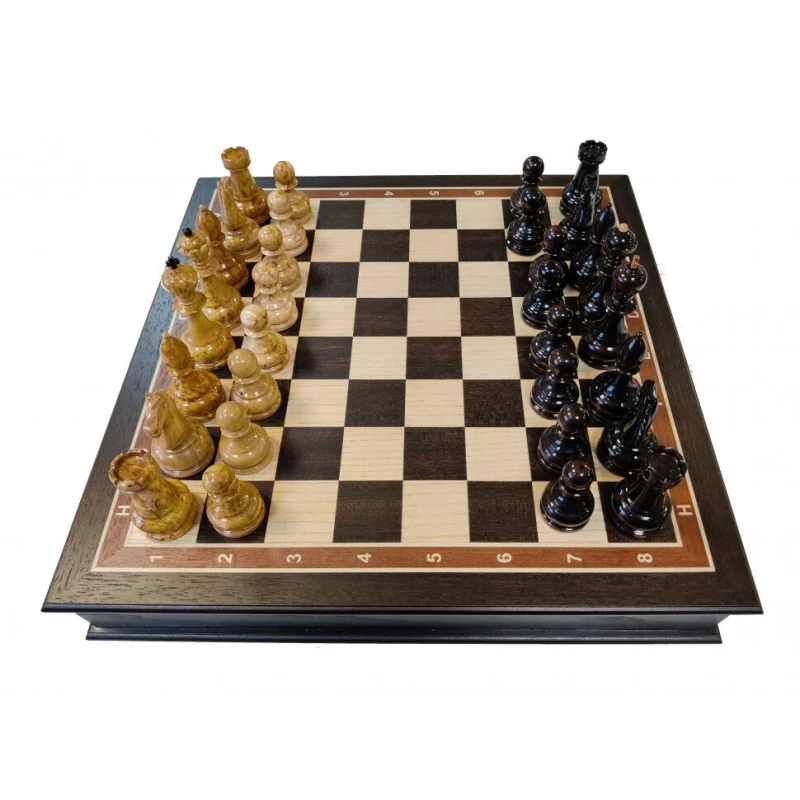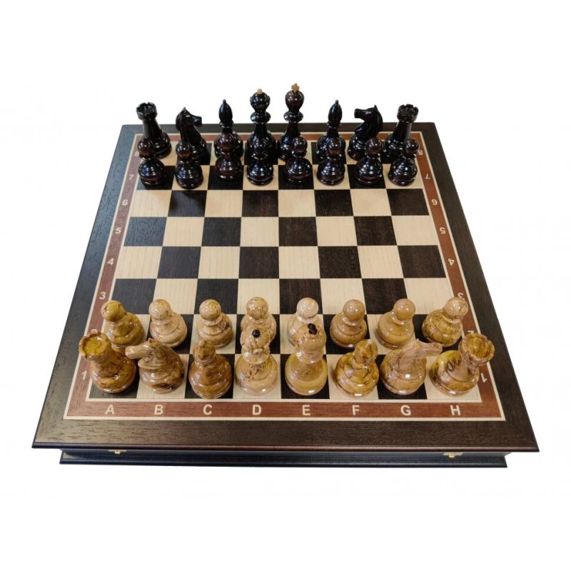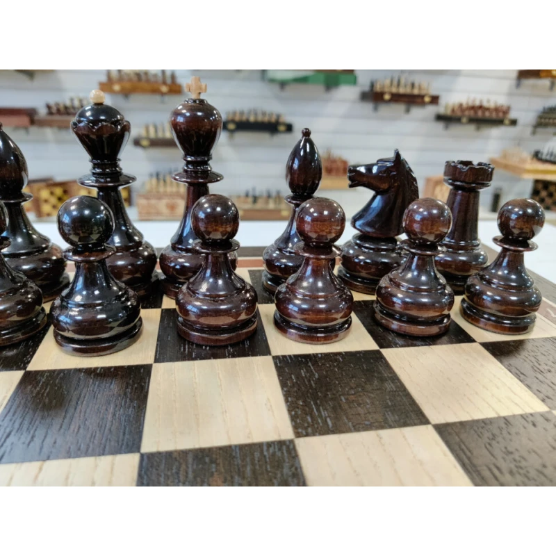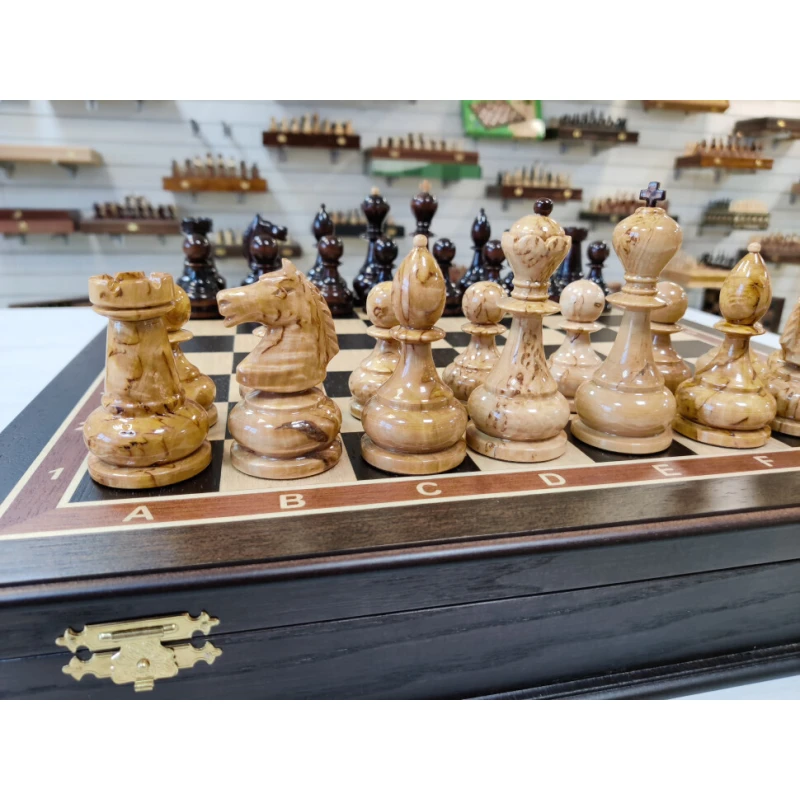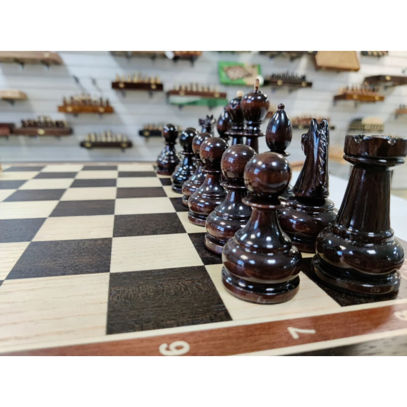 Классические шахматные фигуры выполнены из карельской березы и покрыты рояльным лаком.