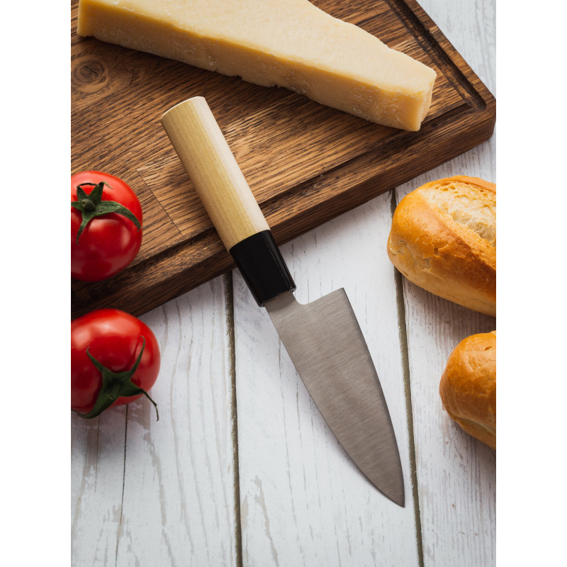 Кухонный Нож Деба Мини FUJI CUT REIGETSU Описание: Добро пожаловать в мир японского мастерства! Представляем вам кухонный нож Деба мини из серии REIGETSU от компании FUJI CUTLERY. Этот нож воплощает собой традиции Японии, где рыба и морепродукты занимают важное место в питании. Особенности: Узнаваемая форма: Клиновидная форма и тяжелое утолщенное лезвие с односторонней заточкой. Многофункциональность: Идеально подходит для первичной разделки морской и речной рыбы, а также для отсечения хвостов и плавников. Традиции и современность: Линейка REIGETSU сочетает в себе классический дизайн и функциональность, делая эти ножи отличным выбором для домашних поваров. Преимущества: Высококачественная сталь: Клинок изготовлен из стали Mo-V, которая полностью устойчива к коррозии. Производство: Все лезвия производятся на японском предприятии Fuji Cutlery Co., что гарантирует высочайшее качество. Конкурентоспособные цены: Ножи REIGETSU предлагают превосходное соотношение цена-качество. Эргономичная рукоять: Изготовленная из магнолии, она обеспечивает удобство и комфорт при длительном использовании. Современный дизайн: Лаконичный и стильный внешний вид прекрасно дополнит любую кухню. Характеристики: Общая длина ножа: 270 мм Длина лезвия: 10.5 см Ширина клинка: 3.6 см Толщина клинка: 1.9 мм Твердость лезвия (HRC): 57-58 Заточка: #5000 Размер упаковки: 290x50x20 мм Вес брутто: 0.08 кг Страна производства: Япония Производитель: FUJI CUTLERY Заключение: Нож Деба мини из серии REIGETSU – это не просто инструмент, а настоящее произведение искусства. Он станет вашим надежным помощником на кухне, помогая создавать вкусные и красивые блюда. Сделайте свой кулинарный процесс более легким и приятным с этим уникальным японским ножом. Не упустите возможность приобрести этот шедевр кулинарного мастерства по доступной цене!