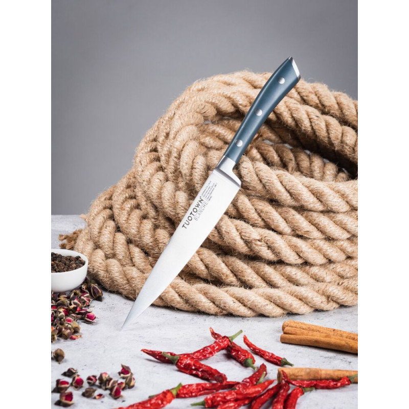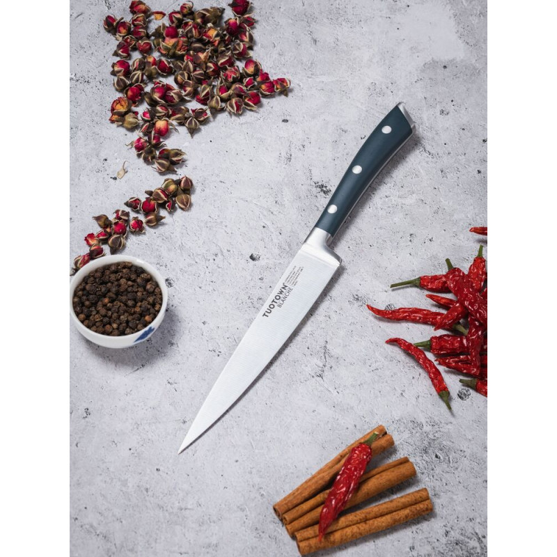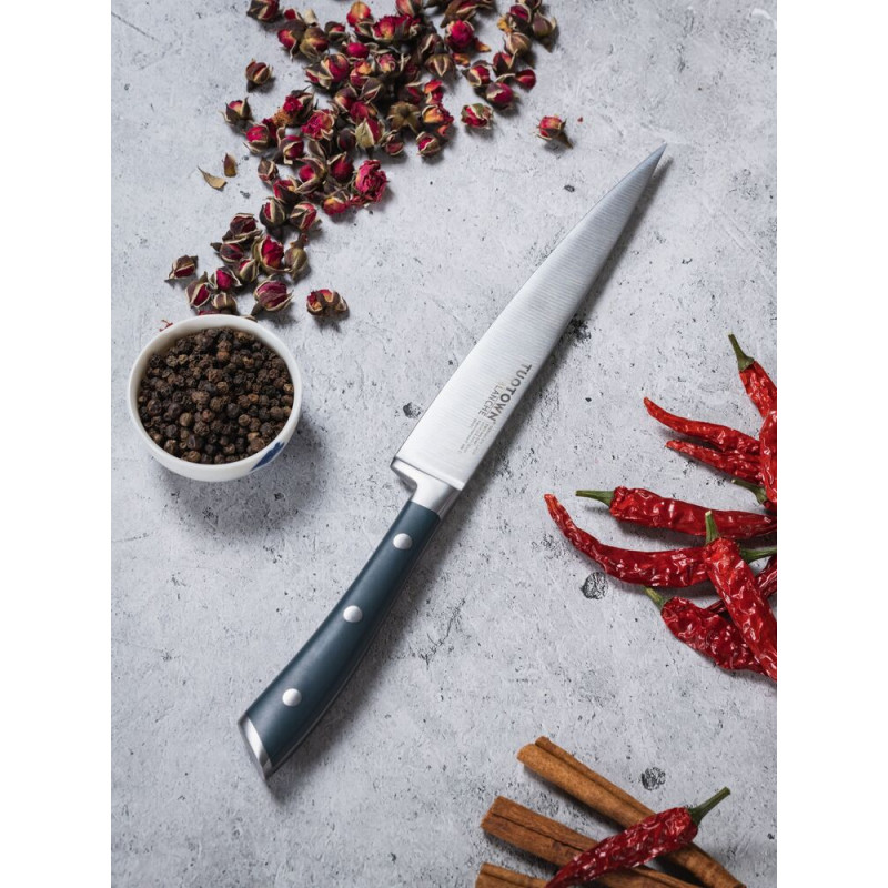 Кухонный нож Blanche универсальный от TuoTown — идеальный инструмент для всех кухонных задач Нож Blanche универсальный от TuoTown — это незаменимый кухонный нож, который справится с любыми задачами на кухне. Благодаря своим компактным размерам и высокой прочности, он идеально подходит для нарезки, разделки и измельчения различных продуктов. Этот нож станет отличным выбором как для профессиональных поваров, так и для домашних кулинаров, обеспечивая комфорт и точность в каждой работе. Характеристики кухонного ножа Blanche универсальный от TuoTown: Нержавеющая сталь German DIN 1.4116: Клинок ножа изготовлен из высококачественной немецкой стали с твердостью 58HRC, что гарантирует отличную остроту, долговечность и стойкость к коррозии. Нож сохраняет свою остроту даже при длительном использовании, что делает его идеальным инструментом для ежедневных кухонных задач. Эргономичная рукоять из ABS пластика: Рукоять ножа выполнена из прочного и удобного ABS пластика, который обеспечивает надежный и комфортный хват. Это позволяет работать с ножом без усталости и напряжения, даже при длительном использовании. Оптимальные размеры для универсального использования: Общая длина ножа: 27 см Длина клинка: 15 см Ширина клинка: 2,5 см Толщина обуха: 1,5 мм Эти параметры делают нож Blanche универсальный отличным выбором для нарезки, разделки и измельчения овощей, мяса, рыбы и других продуктов. Он идеально подходит для выполнения широкого спектра кухонных задач. Почему стоит выбрать кухонный нож Blanche универсальный от TuoTown? Этот кухонный нож сочетает в себе прочность, остроту и удобство. Он идеально подходит для всех типов кулинарных работ, от нарезки овощей до работы с мясом и рыбой. Также нож Blanche универсальный станет отличным подарком для любителей кулинарии и профессиональных поваров, ценящих качество и надежность. Добавьте кухонный нож Blanche универсальный от TuoTown в свою коллекцию и наслаждайтесь комфортом и точностью при каждой нарезке!