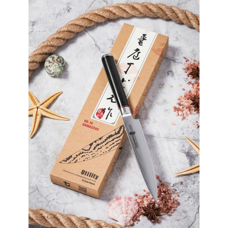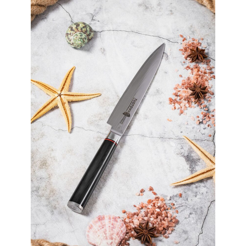 Универсальный кухонный нож TuoTown — функциональность и стиль для вашей кухни Нож универсальный от TuoTown создан для тех, кто ценит удобство и качество на кухне. Этот нож подходит для любых задач: нарезки овощей, фруктов, мяса и рыбы. Компактный, но мощный инструмент станет вашим надежным помощником в ежедневной готовке. Преимущества универсального ножа TuoTown: Высококачественный клинок: Лезвие длиной 14,5 см выполнено из премиальной стали VG10 с обкладками из 66 слоев дамасской стали. Такое сочетание обеспечивает ножу превосходную остроту, долговечность и устойчивость к коррозии. Уникальный узор на клинке добавляет эстетики и подчеркивает премиальный статус изделия. Эргономичная рукоять: Рукоять из G10 отличается прочностью, влагостойкостью и удобным хватом. Легкая и надежная конструкция позволяет работать ножом с комфортом даже при длительном использовании. Компактные размеры: Общая длина ножа: 26,5 см Длина клинка: 14,5 см Ширина клинка: 2,5 см Толщина обуха: 1,8 мм Эти параметры делают нож универсальным выбором как для мелкой нарезки, так и для работы с более крупными продуктами. Почему выбирают TuoTown? TuoTown — это сочетание современных технологий и традиционного мастерства. Универсальный нож создан для того, чтобы сделать процесс готовки быстрее, удобнее и приятнее. Добавьте универсальный нож TuoTown в свою коллекцию кухонных инструментов и наслаждайтесь каждым этапом готовки!