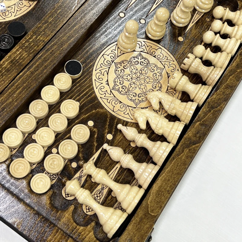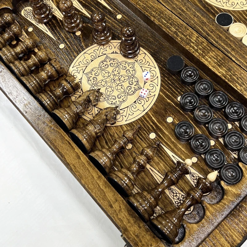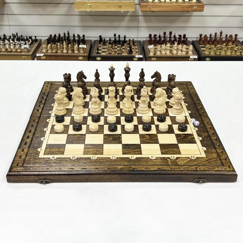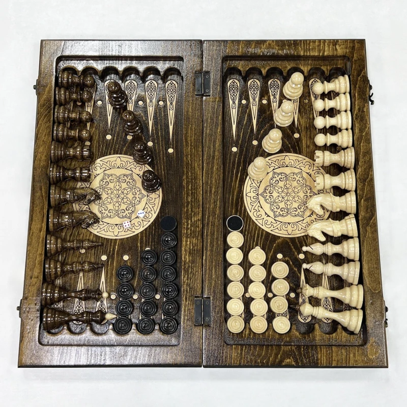 Шахматы, нарды, шашки - это оригинальное сочетание самых популярных настольных игр в одной доске. Качественные, натуральные материалы сделаю вашу игру незабываемой. Доска выполнена из массива бука и сделана вручную мастером. Размер доски 50 х 50 х 3 см, размер клетки 4,5 см. Изящные фигуры в классическом стиле идеально дополняют этот набор 3 в 1. Сделаны из кавказского граба и обработаны глянцевым лаком. Высота короля - 10 см, высота пешки - 5,5 см. Шашки (фишки для нард), которые идут в комплекте с данным набором, сделаны из бука. Размер- 2 см. Великолепный выбор для любителей интересно и качественно провести свой досуг!