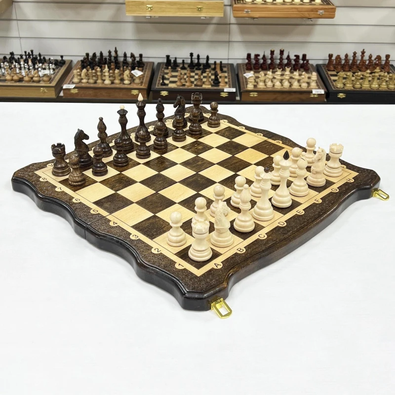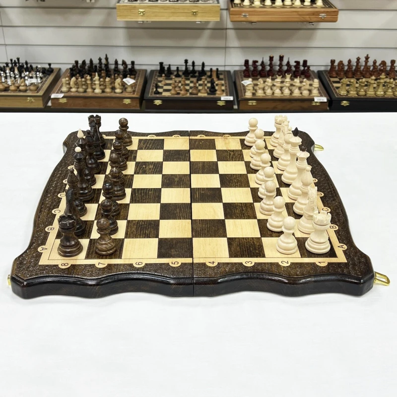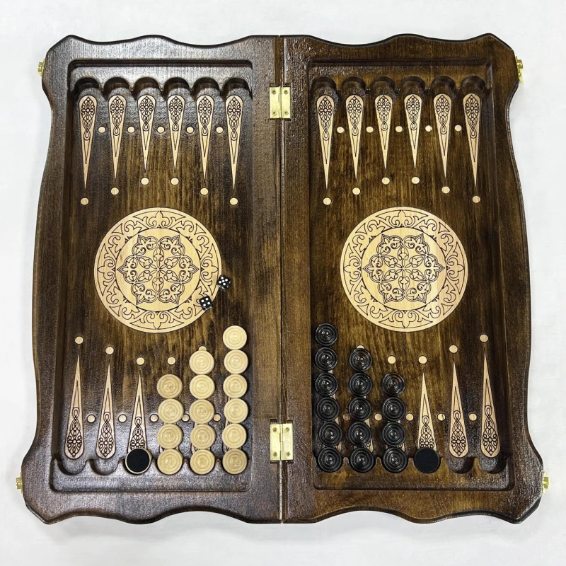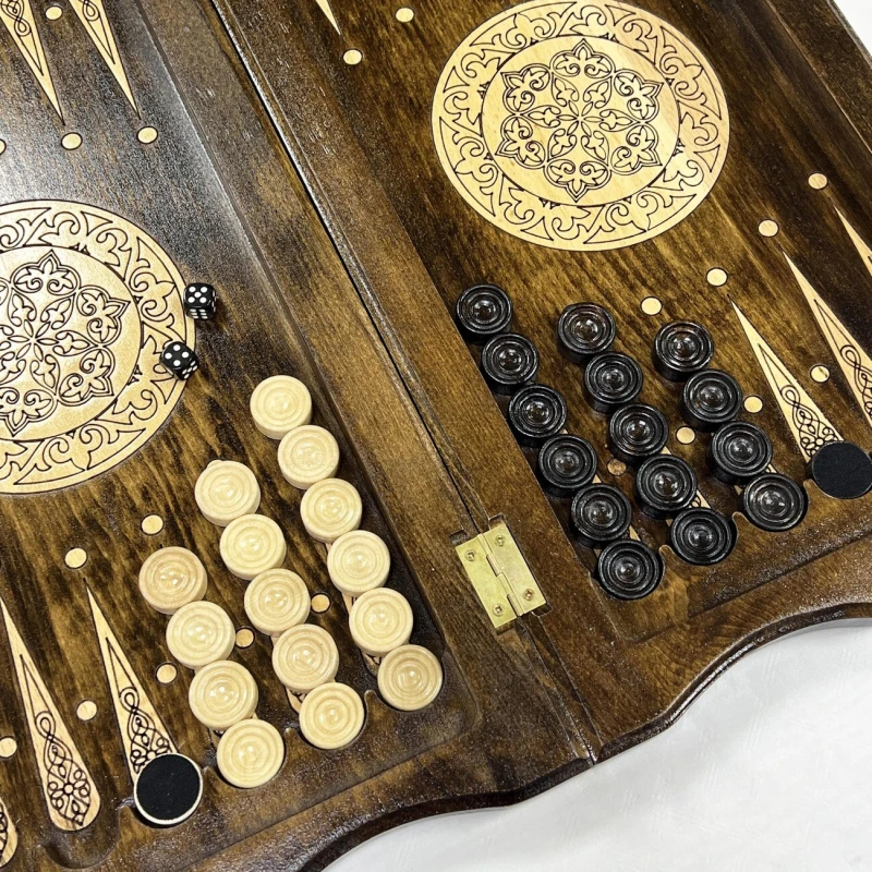 Сердцем набора является искусно изготовленная доска из массива бука. В разложенном виде ее размер составляет 50 на 50 сантиметров, что обеспечивает комфортное пространство для игры. Внутри доски скрыто поле для игры в нарды, а в комплекте вы найдете все необходимые фишки и кости.