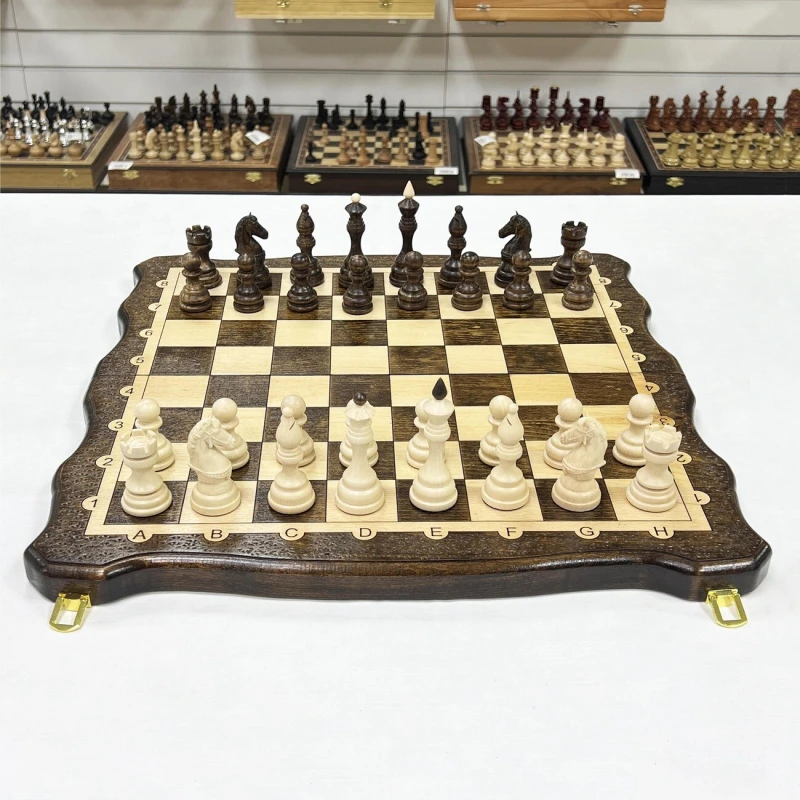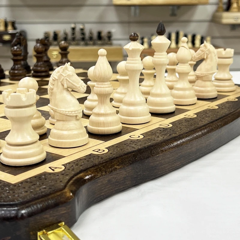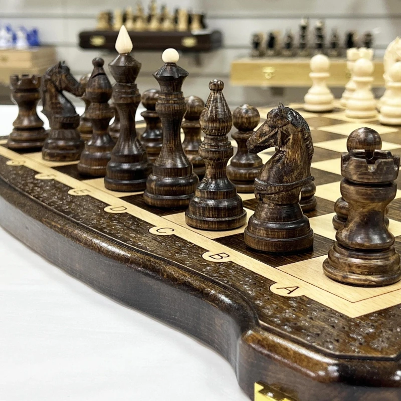 Особого внимания заслуживают шахматные фигуры, вырезанные вручную из ценной и прочной древесины кавказского граба. Каждая фигура тщательно проработана, утяжелена для придания устойчивости и подклеена у основания, чтобы защитить доску от царапин. Размер короля – внушительные 10 сантиметров, а пешки – 5,5 сантиметров, что придает игре солидность и основательность.