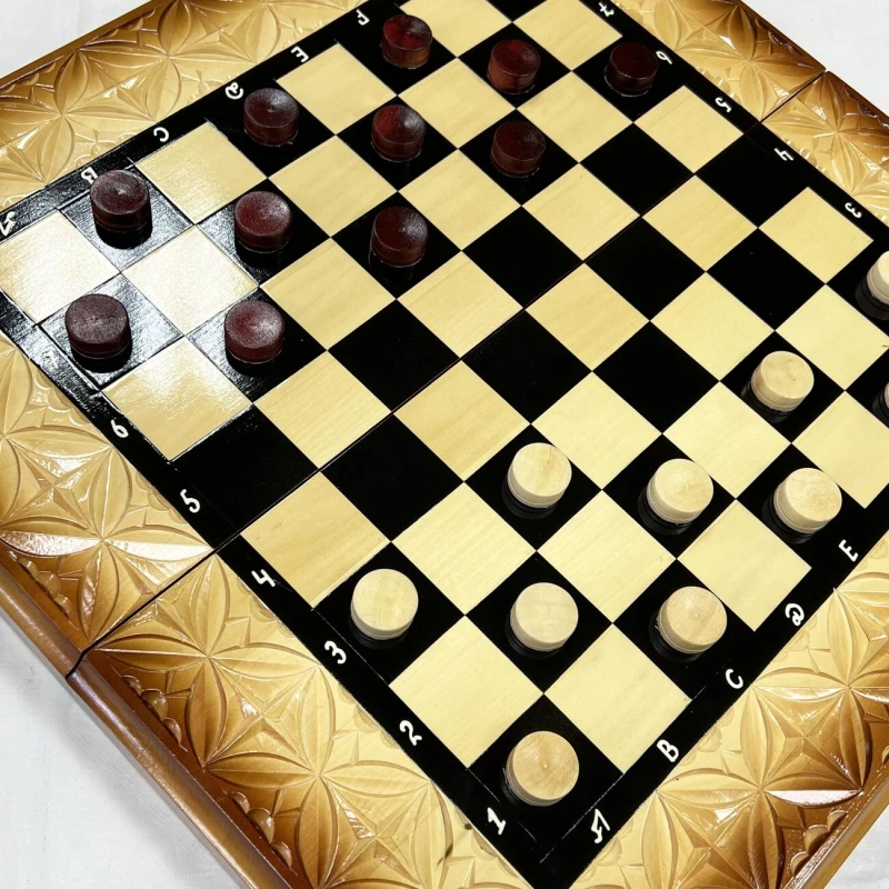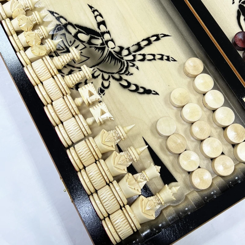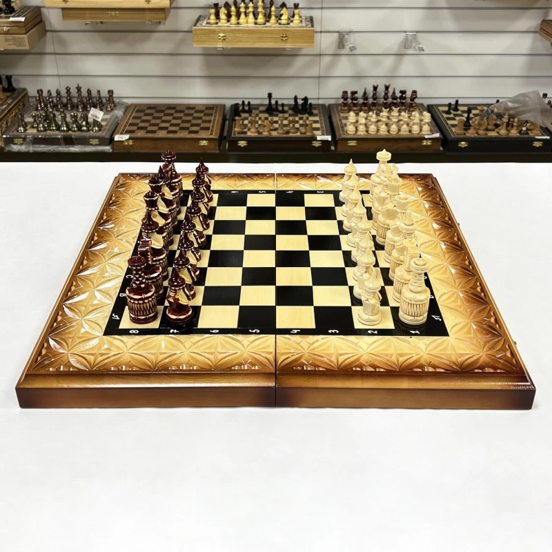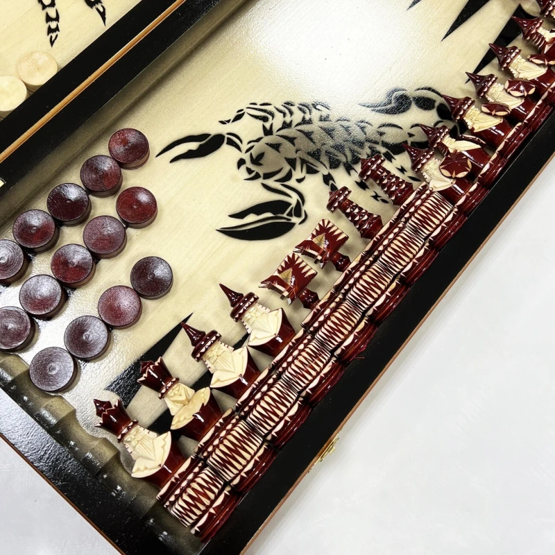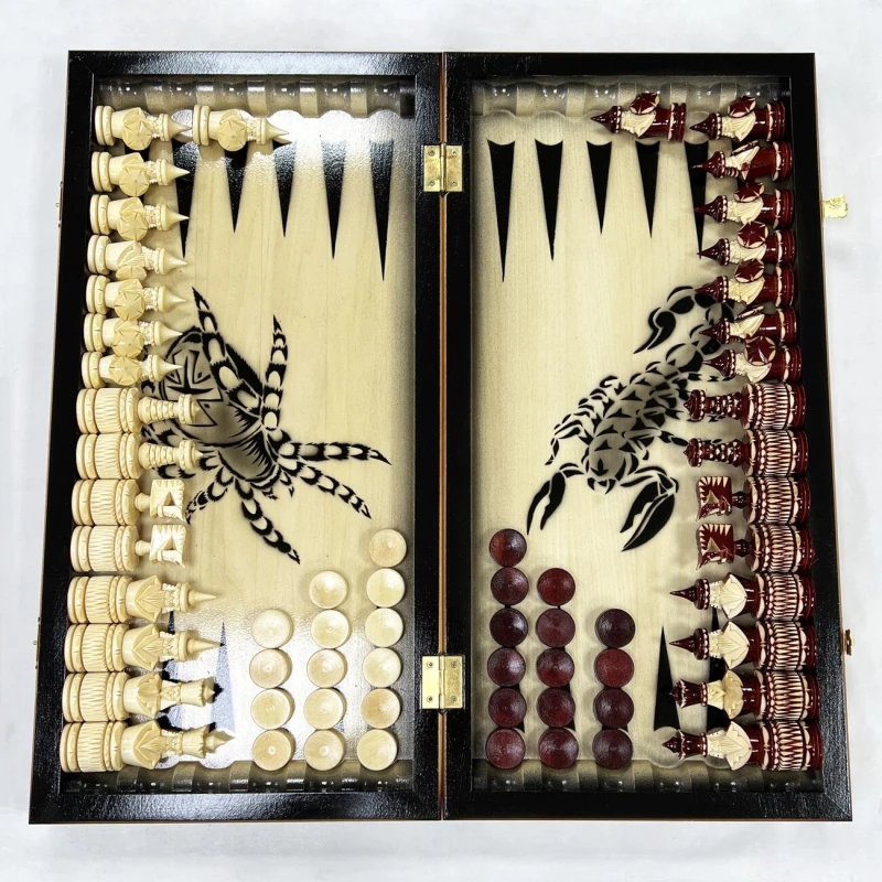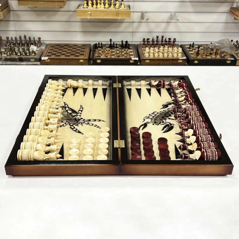 Игровой набор 3 в 1: шахматы, шашки, нарды с рисунком Паука и Скорпиона! Эта уникальная деревянная доска из массива липы размером 60 на 60 см в разложенном виде станет не только полем для интеллектуальных сражений, но и памятным сувениром. На поверхности доски- резной рисунок ручной работы, изображающий красивый орнамент. Внутри доски поле для игры в нарды. В комплекте идут деревянные шахматные фигуры (король высотой 12 см, пешка – 7 см) и деревянные фишки, которые можно использовать как для игры в нарды, так и для шашек. Этот набор станет отличным подарком для любителей настольных игр.