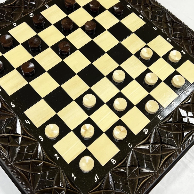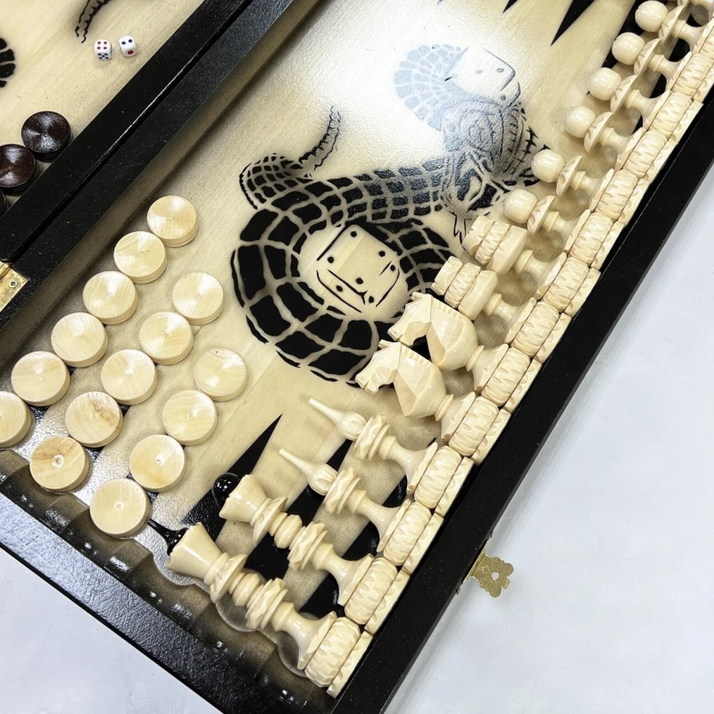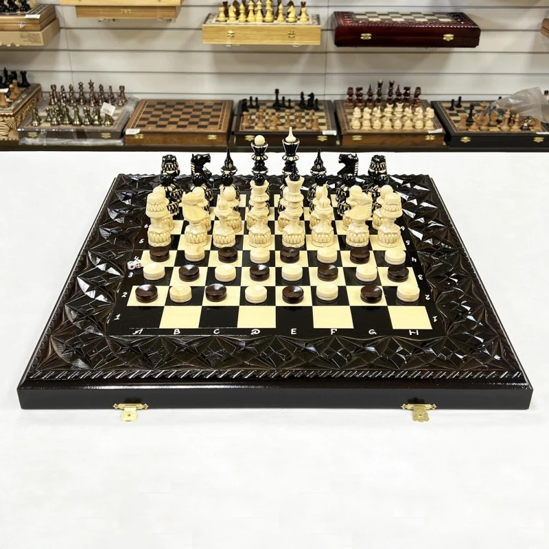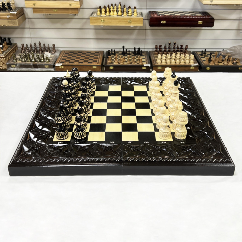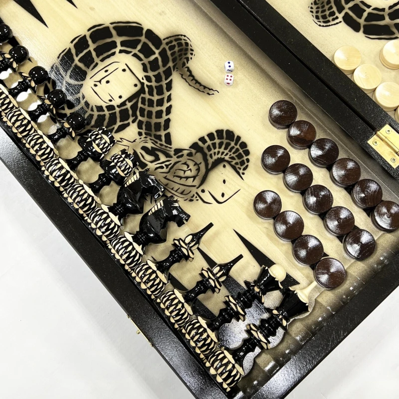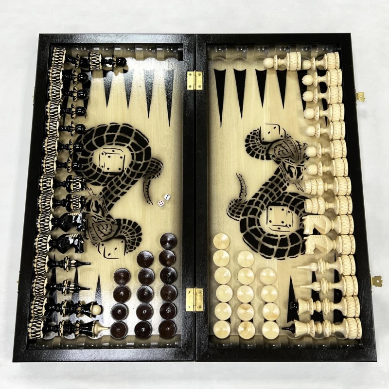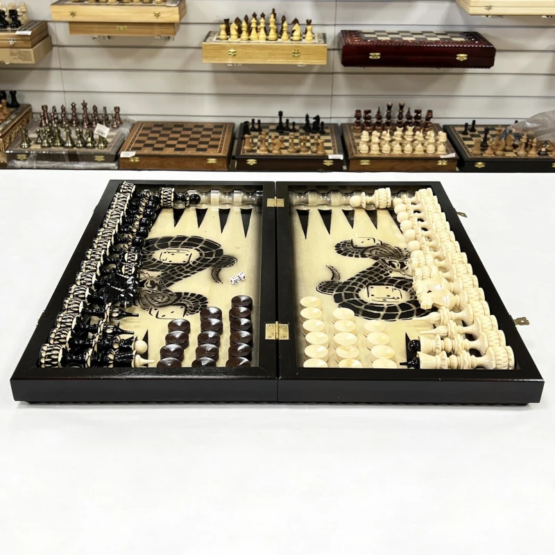 Игровой набор 3 в 1: шахматы, шашки, нарды Змея! Эта уникальная деревянная доска из массива липы размером 60 на 60 см в разложенном виде станет не только полем для интеллектуальных сражений, но и памятным сувениром. На поверхности доски- резной рисунок ручной работы, изображающий красивый орнамент. Внутри доски поле для игры в нарды. В комплекте идут деревянные шахматные фигуры (король высотой 12 см, пешка – 7 см) и деревянные фишки, которые можно использовать как для игры в нарды, так и для шашек. Этот набор станет отличным подарком для любителей настольных игр.