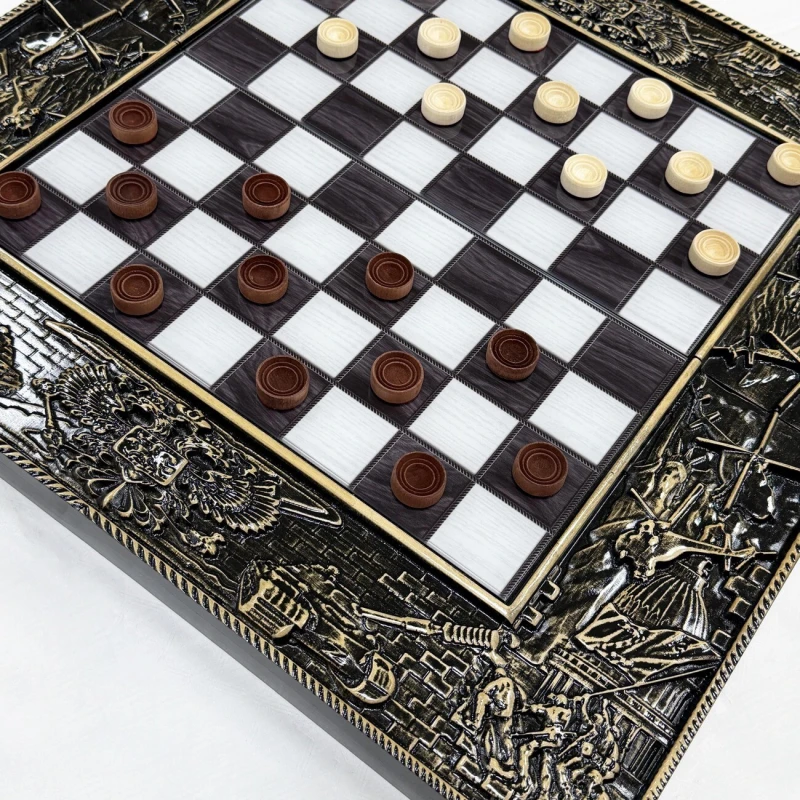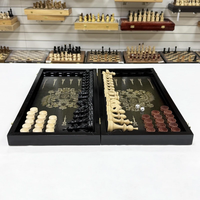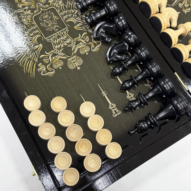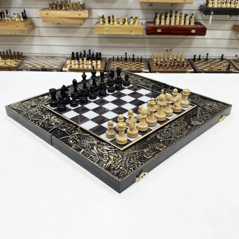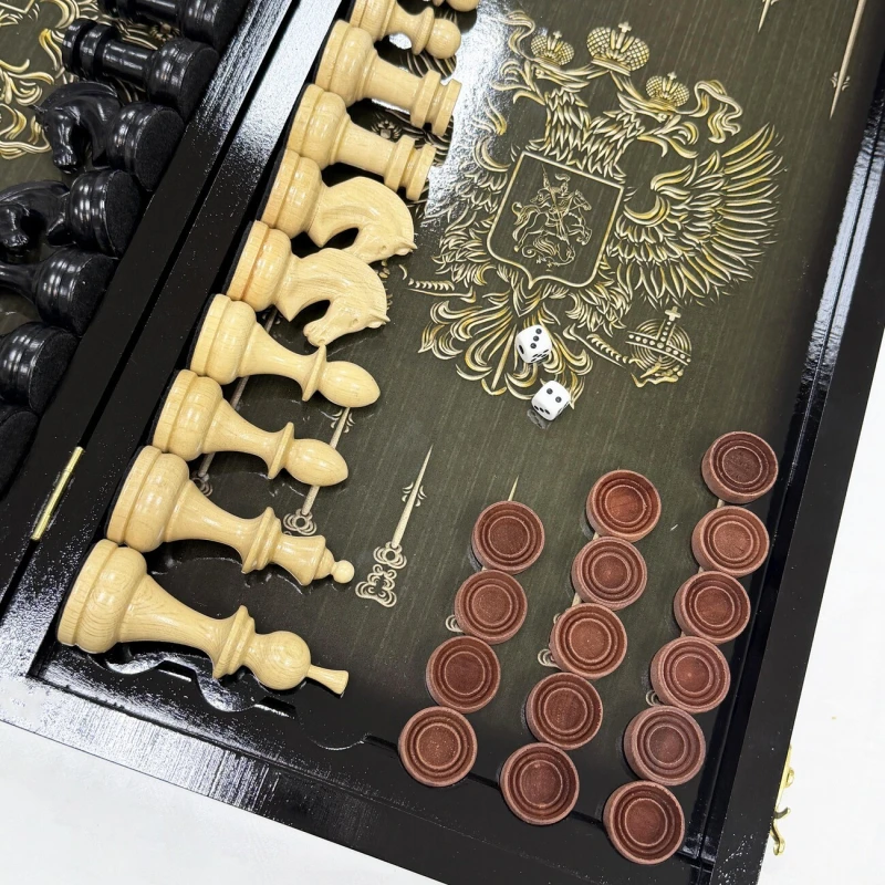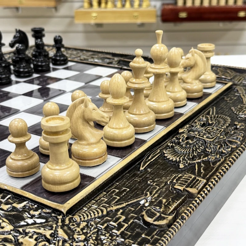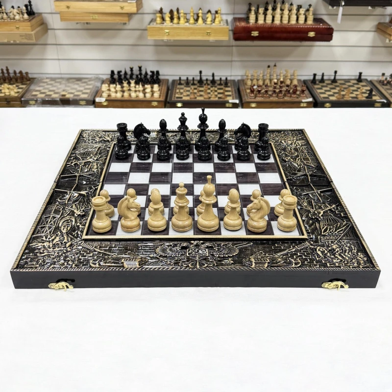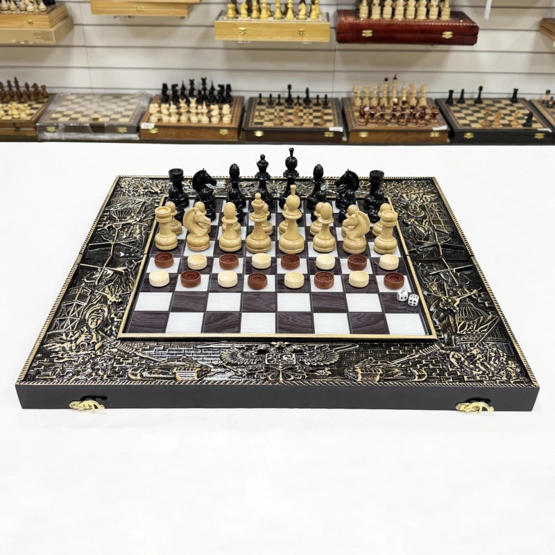 Игровой набор 3 в 1: шахматы, шашки, нарды Победа! Эта уникальная деревянная доска из массива липы и стеклянным панно в центре доски размером 60 на 60 см в разложенном виде станет не только полем для интеллектуальных сражений, но и памятным сувениром. На поверхности доски- резной рисунок ручной работы, изображающий красивый орнамент, гравировка и стеклянное поле. Внутри доски поле для игры в нарды. В комплекте идут деревянные шахматные фигуры (король высотой 10 см, пешка – 5 см) и деревянные фишки, которые можно использовать как для игры в нарды, так и для шашек. Этот набор станет отличным подарком для любителей настольных игр.