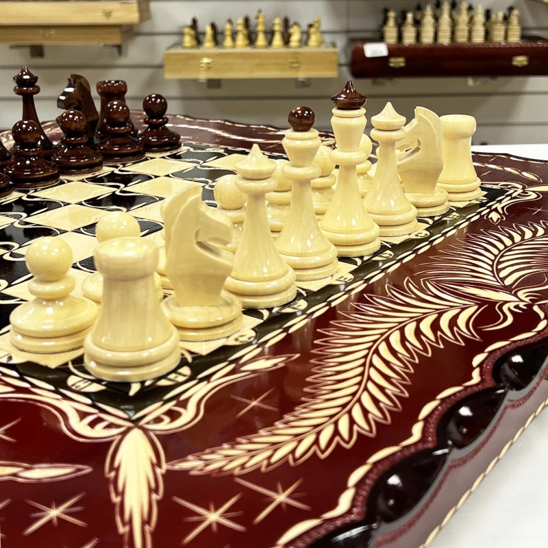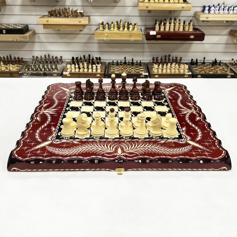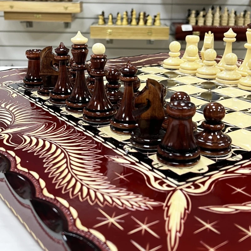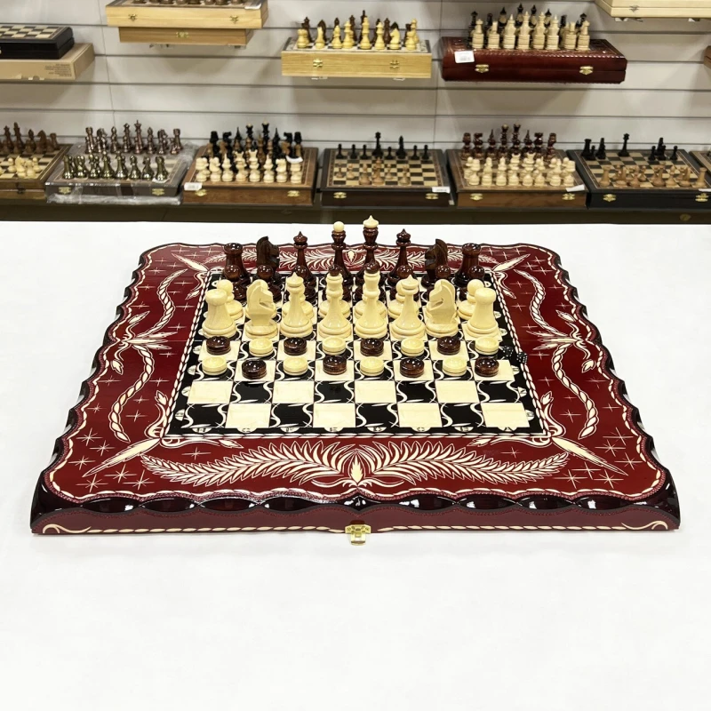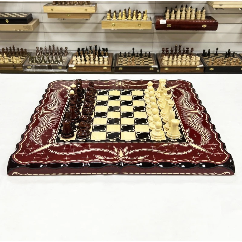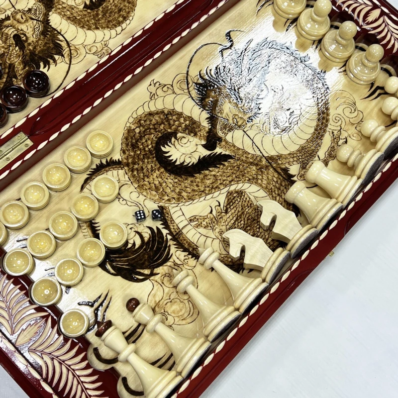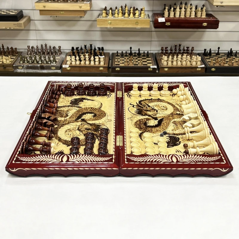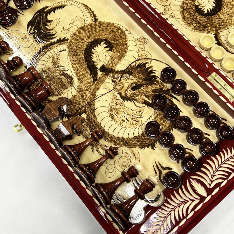 Игровой набор 3 в 1: шахматы, шашки, нарды Красный дракон! Эта уникальная деревянная доска из массива липы размером 60 на 60 см в разложенном виде станет не только полем для интеллектуальных сражений, но и памятным сувениром. На поверхности доски- резной рисунок ручной работы, изображающий красивый орнамент. Внутри доски поле для игры в нарды. В комплекте идут деревянные шахматные фигуры (король высотой 12 см, пешка – 7 см) и деревянные фишки, которые можно использовать как для игры в нарды, так и для шашек. Этот набор станет отличным подарком для любителей настольных игр.