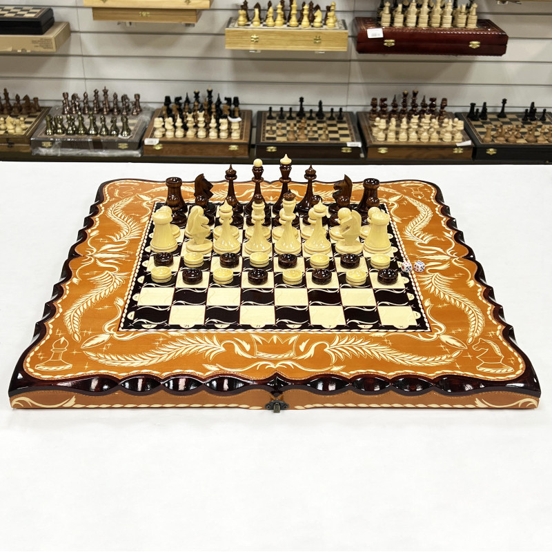 Игровой набор 3 в 1: шахматы, шашки, нарды Оранжевый лев! Эта уникальная деревянная доска из массива липы размером 60 на 60 см в разложенном виде станет не только полем для интеллектуальных сражений, но и памятным сувениром. На поверхности доски- резной рисунок ручной работы, изображающий красивый орнамент. Внутри доски поле для игры в нарды. В комплекте идут деревянные шахматные фигуры (король высотой 12 см, пешка – 7 см) и деревянные фишки, которые можно использовать как для игры в нарды, так и для шашек. Этот набор станет отличным подарком для любителей настольных игр.