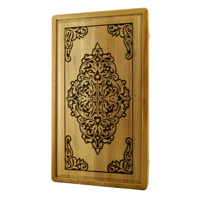 Резные нарды из массива бука. Внутри доски есть ячейки для хранения фишек. В комплекте игральные кости и фишки. Нарды упакованы в картонную коробку. Производство Россия.