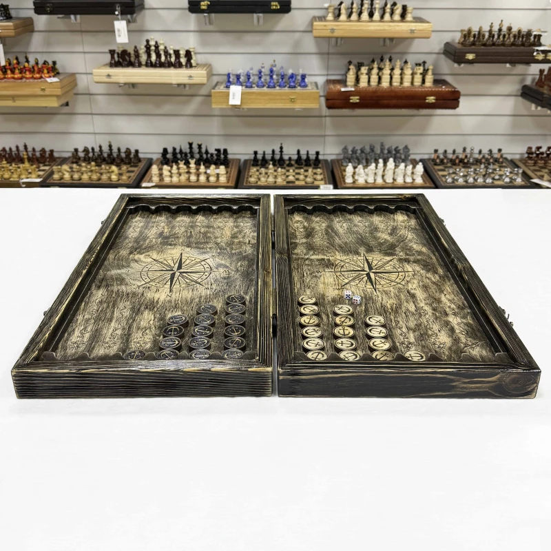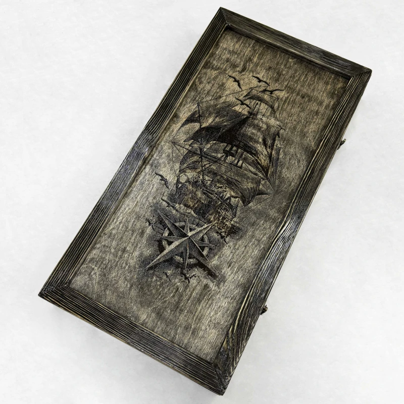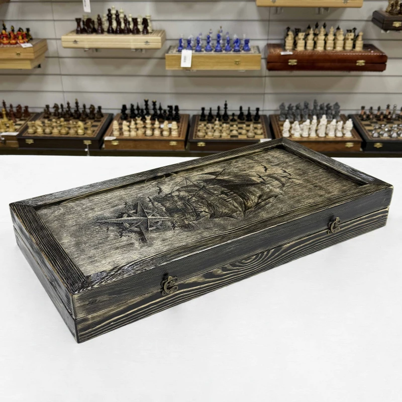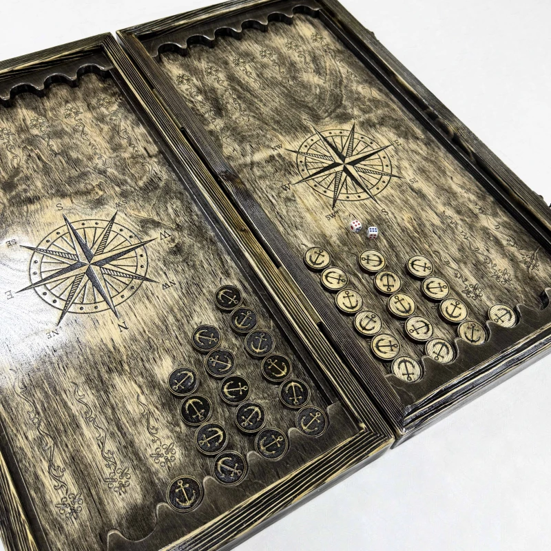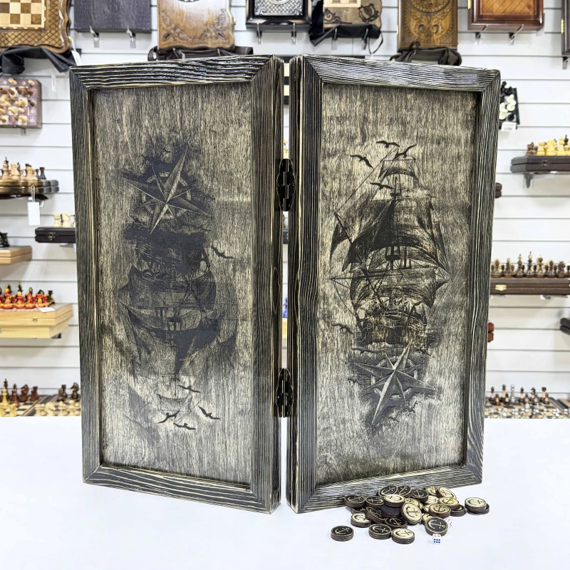 Деревянные нарды ручной работы с рисунком Корабля в морской тематике. Размер нард 60 на 60 см в открытом виде. Древесина, для изготовления нард, проходит специальный этап броширования, после которого мягкие волокна удаляются, а твердые остаются. Это создает выразительный рельеф, который придает древесине эффект состаривания. В комплекте идут деревянные фишки с подклейкой - 30 шт и кости -2 шт. Сделано в России.