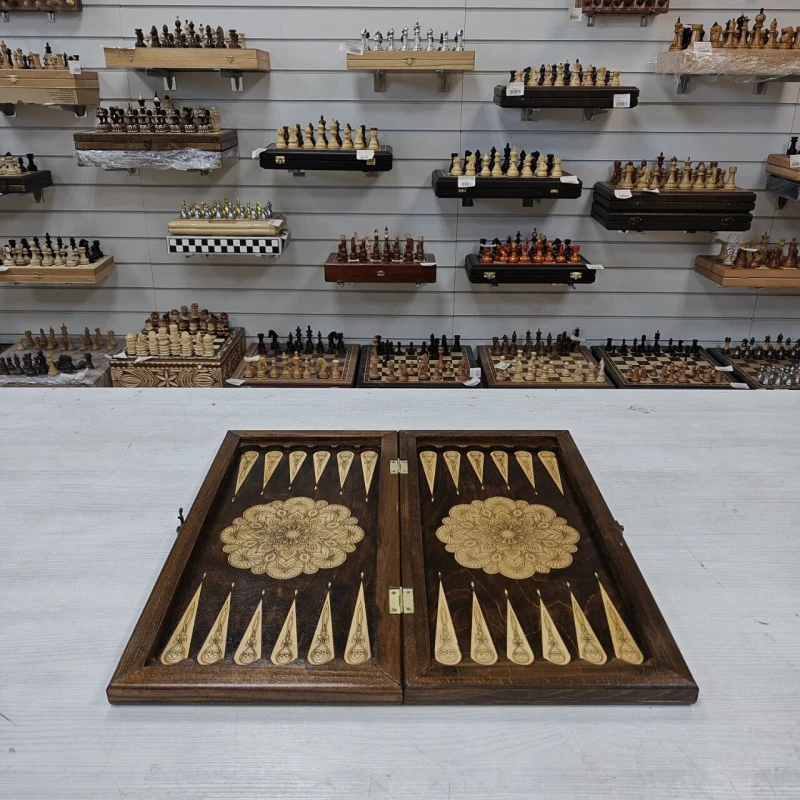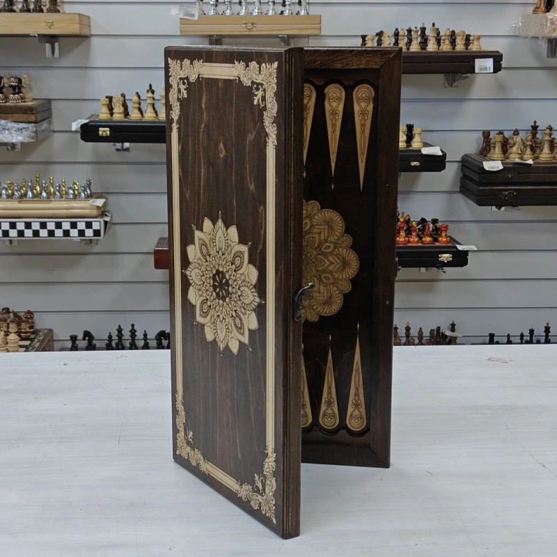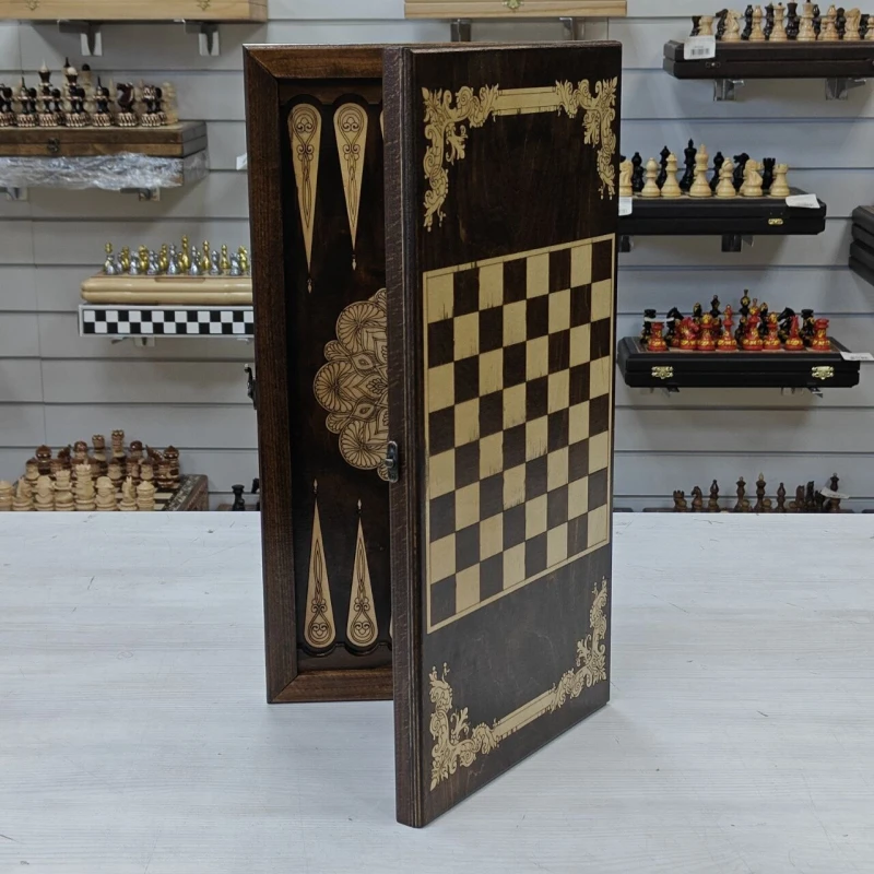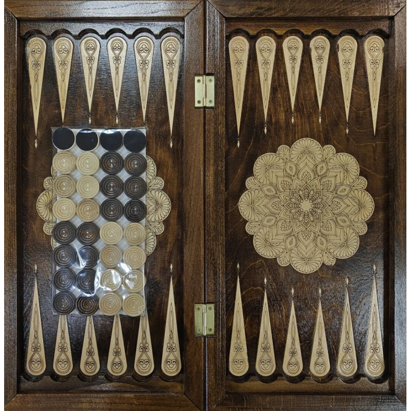Длинные нарды выполнены из дерева, в комплекте фишки из бука с диаметром 3см. Размер нард 50х50см в разложенном виде. На лицевой стороне нард располагается цветочный узор, на тыльной - поле для игры в шашки. Нарды станут отличным подарком отцу, мужу, брату!
