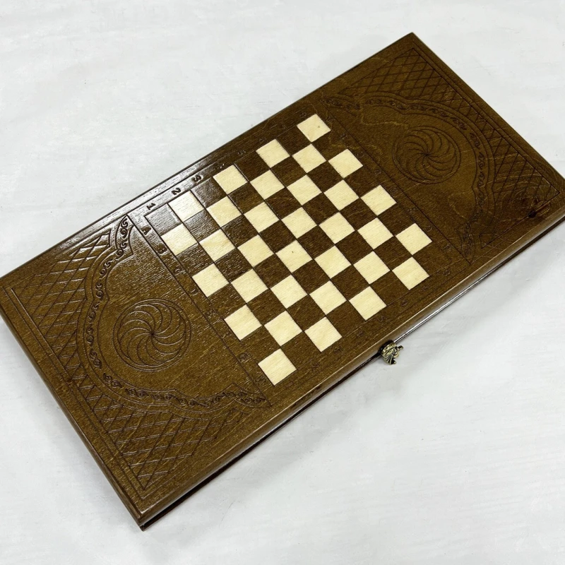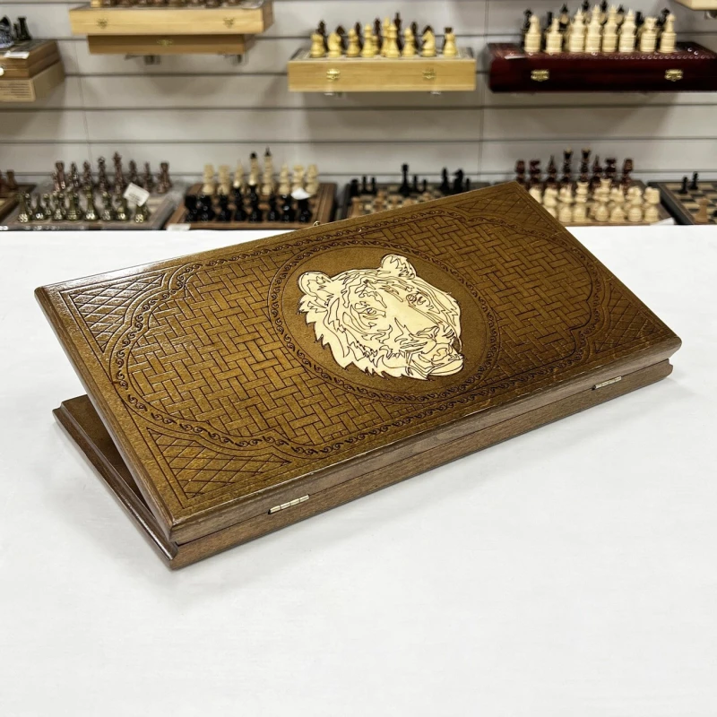 Размер дорожных нард Тигр 40 см. Кроме того, на задней верхней части доски нанесено поле, позволяющее использовать ее для шашек или шахмат. Внутренняя часть доски традиционно предназначена под игру в нарды.
