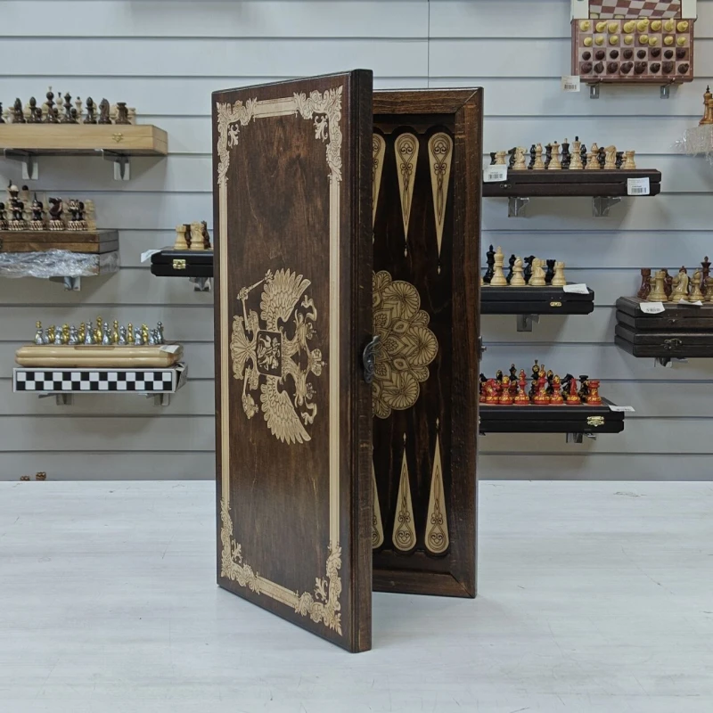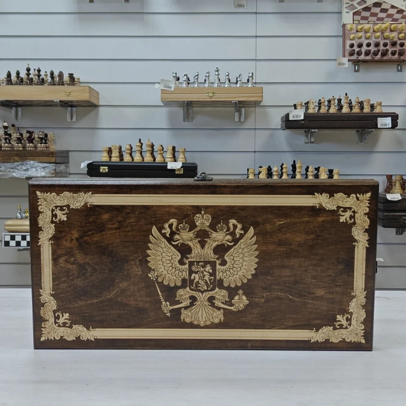 Длинные нарды выполнены из дерева, в комплекте фишки из бука с диаметром 3см. Размер нард 50х50см в разложенном виде. На лицевой стороне нард располагается герб России, на тыльной - поле для игры в шашки. Нарды станут отличным подарком отцу, мужу, брату!