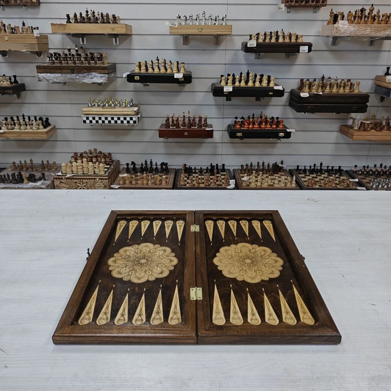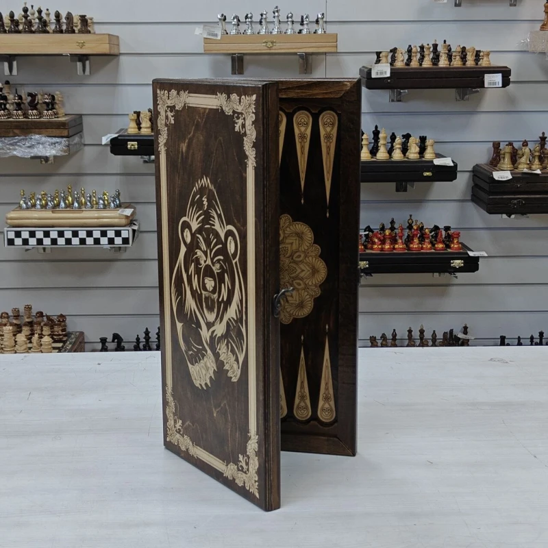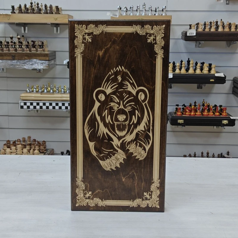 Длинные нарды выполнены из дерева, в комплекте фишки из бука с диаметром 3см. Размер нард 50х50см в разложенном виде. На лицевой стороне нард изображение медведя, на тыльной - поле для игры в шашки. Нарды станут отличным подарком отцу, мужу, брату!
