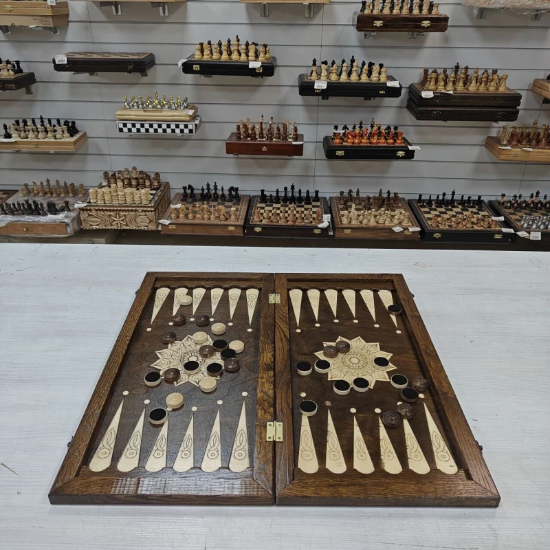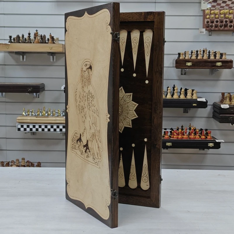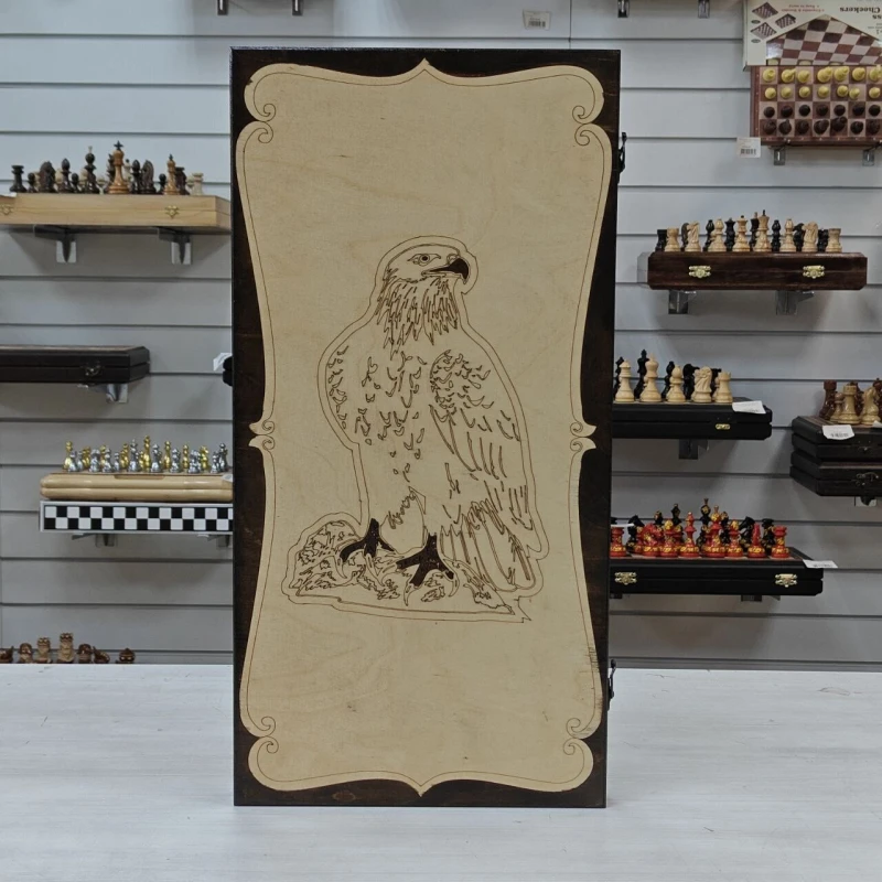 Длинные нарды выполнены из дерева, в комплекте фишки из бука с диаметром 3см. Размер нард 60х60см в разложенном виде. На лицевой стороне нард изображение орла. Нарды отправляем в текстильном чехле. Нарды станут отличным подарком для ваших родных и близких!