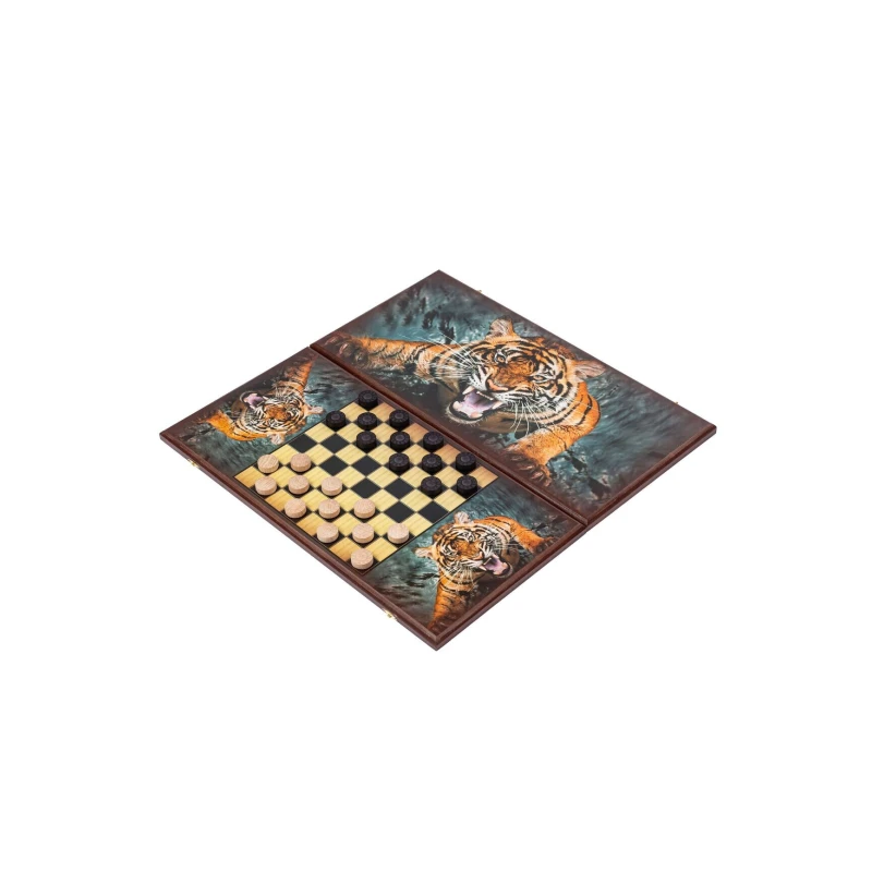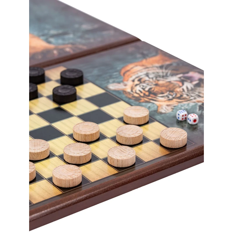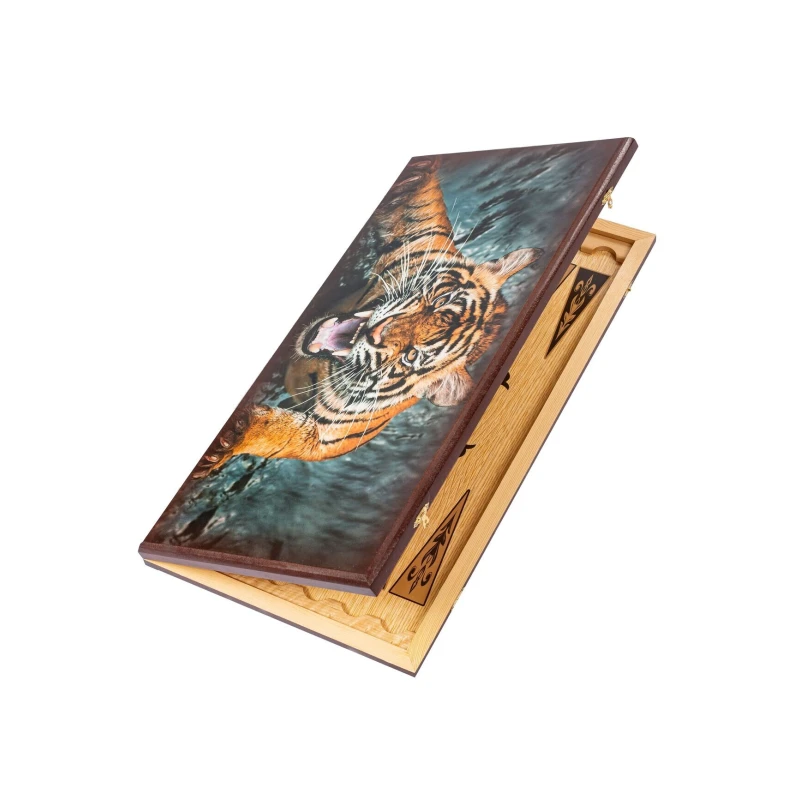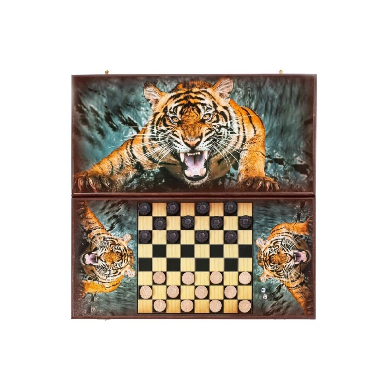 Подарочные нарды из дерева с рисунком Тигра. На обратной стороне есть поле для игры в шашки.
