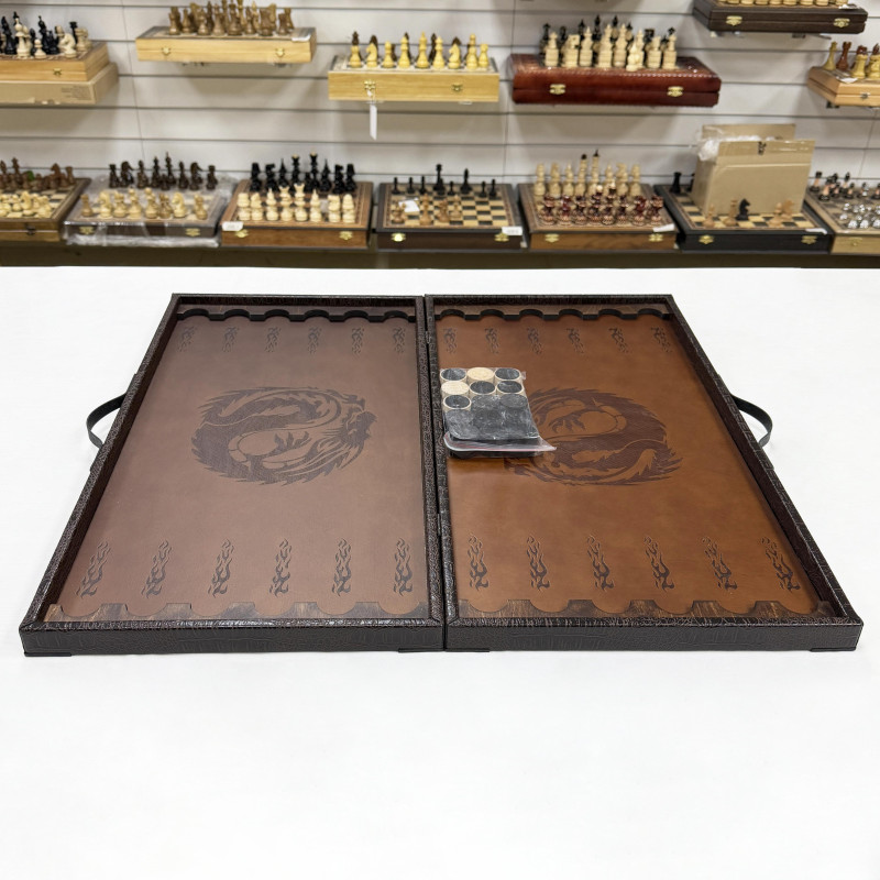 Большие нарды с рисунком Дракона. Размер доски в разложенном виде 62 на 62 см. Размер доски в сложенном виде 62 на 31 см. В комплекте игральные кости и фишки для нард с подклейкой. Подойдут в подарок для детей и взрослых. Сделаны в России. Внутри деревянное поле с рисунком, рисунок делается с помощью гравировки. Нарды удобно брать с собой в дорогу за счет кейса с ручкой.