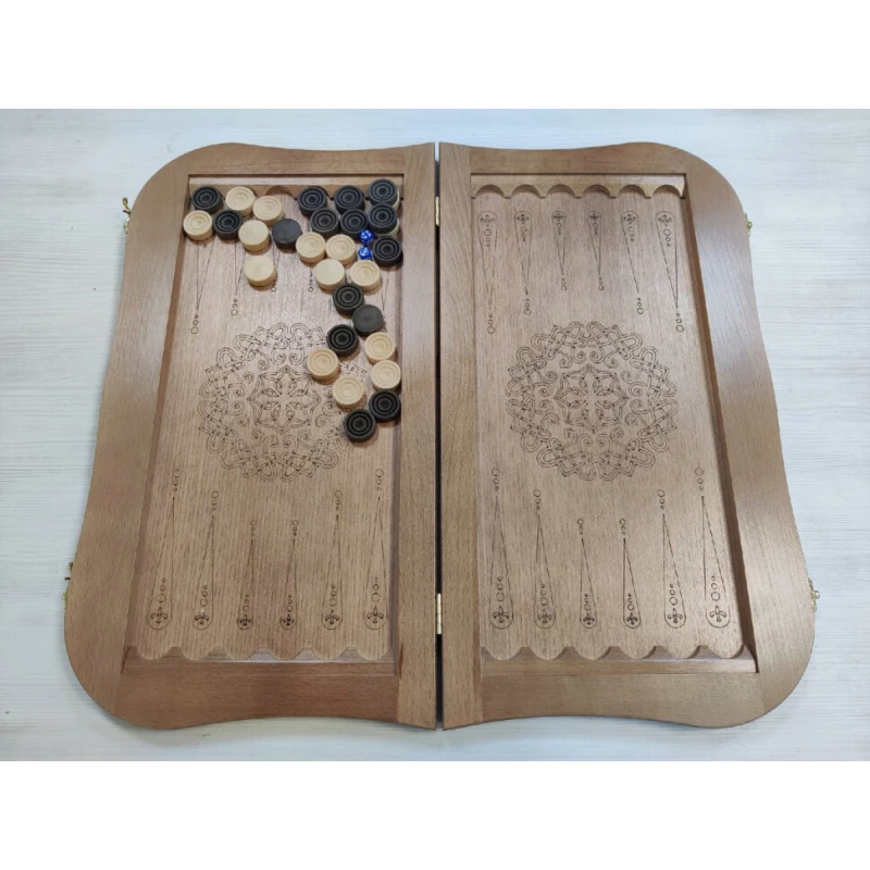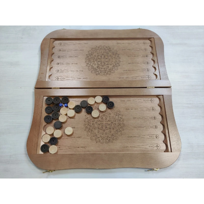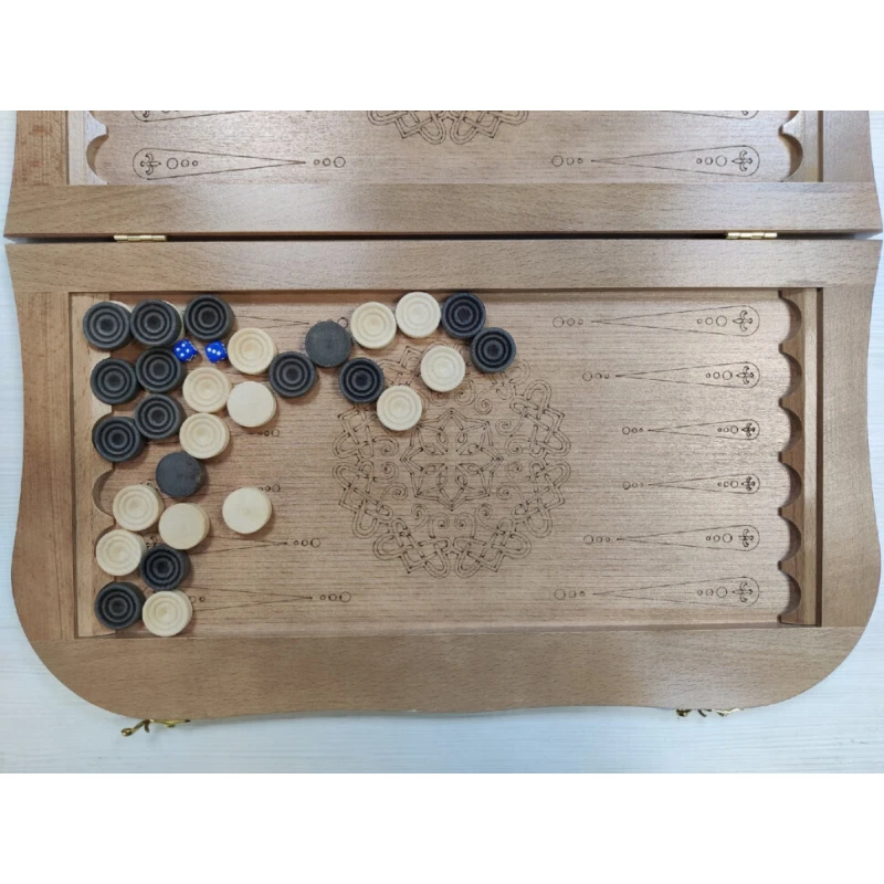 В комплекте игральные кости и фишки для нард. Доска закрывается на 2 замка. Разметка внутри сделана гравировкой.