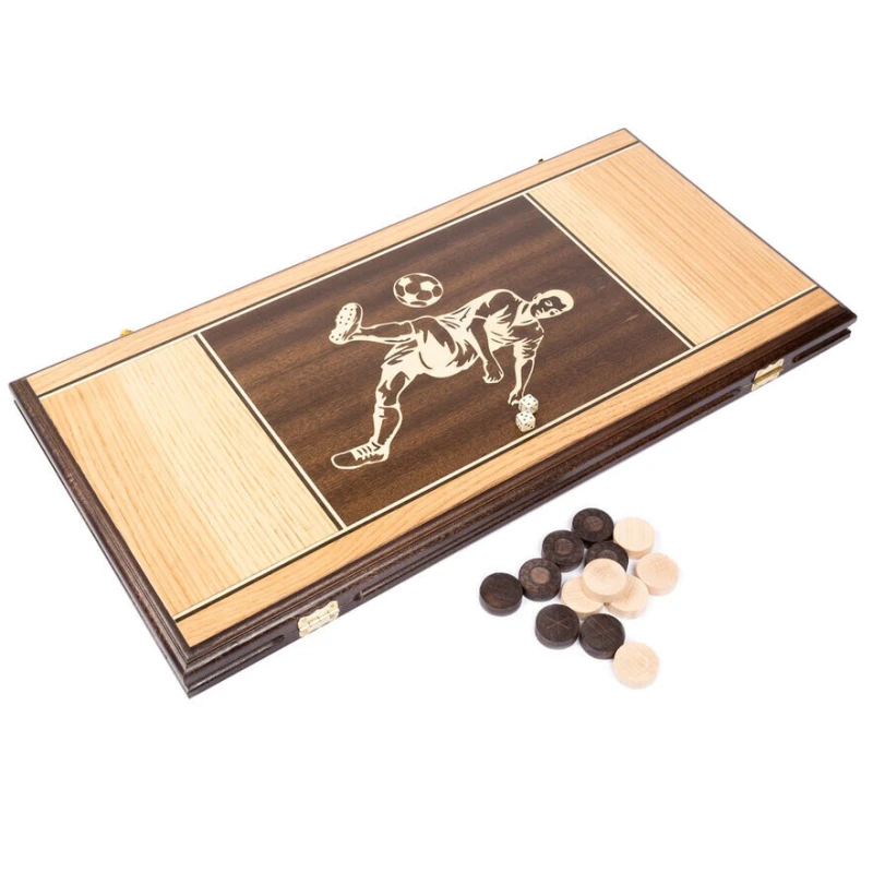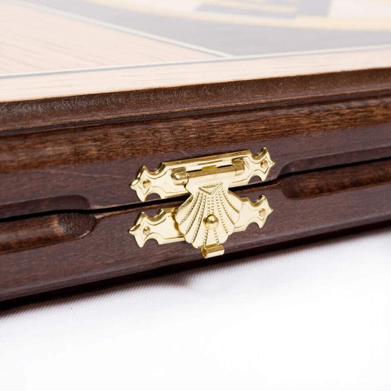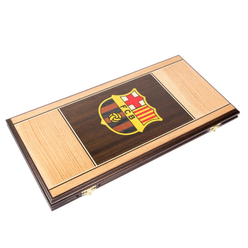 Классические нарды с гербом ФК Барселона. Нарды выполнены в стиле маркетри из ценный пород дерева. Размер доски в развернутом виде 60 на 60 см. В комплекте игральные кости и фишки.