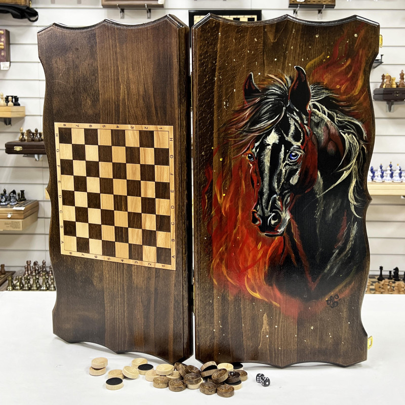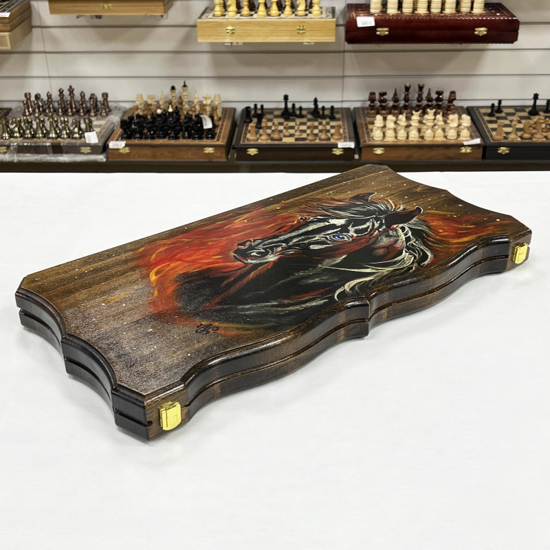Большие эксклюзивные нарды ручной работы из массива бука. Рисунок коня вручную расписан художником. Размер доски в разложенном виде 60 на 60 см. Размер доски в сложенном виде 60 на 30 см. На обратной стороне доски есть поле для шашек. В комплекте игральные кости и фишки для нард. Фишки сделаны из бука с подклейкой, в наборе 32 шт. Нарды ручной работы. Упакованы в чехол для транспортировки. Подойдут в подарок для взрослых и детей. Уникальный резной рисунок, Отличный подарок для ценителей качественных нард.
