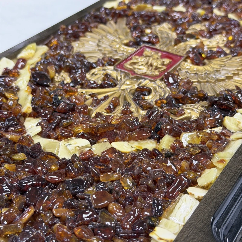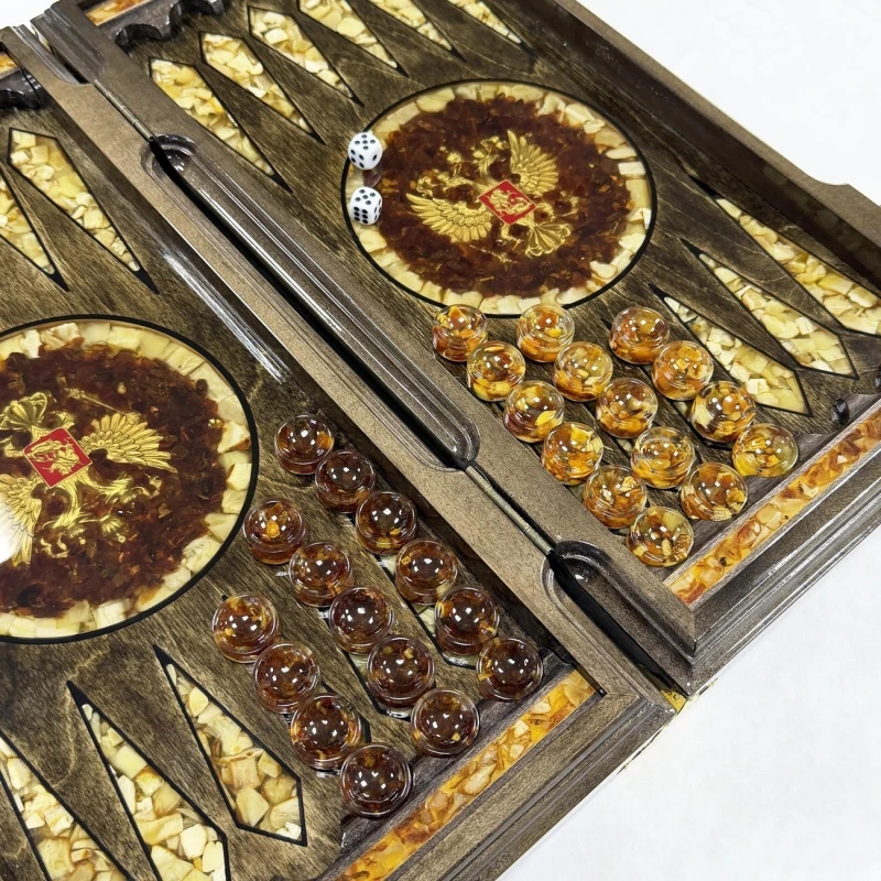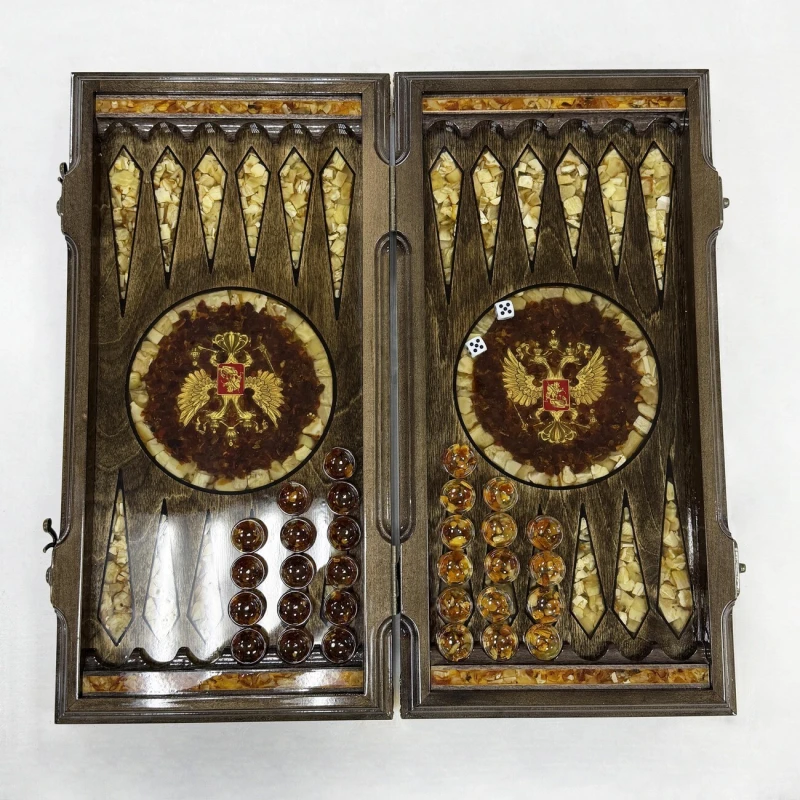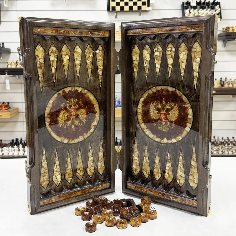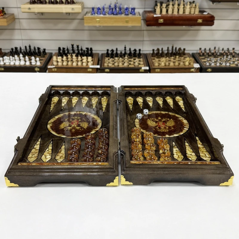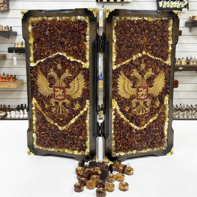 Нарды из янтаря Герб РФ эксклюзивные средние 46 см темные