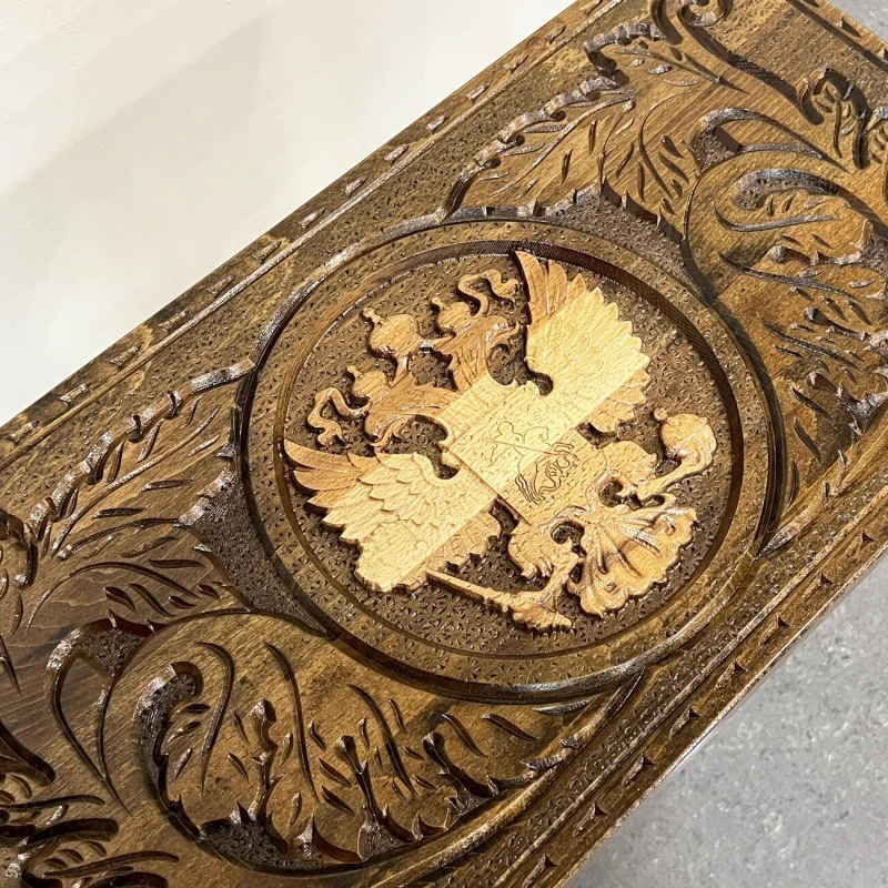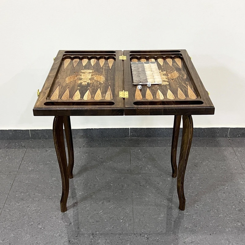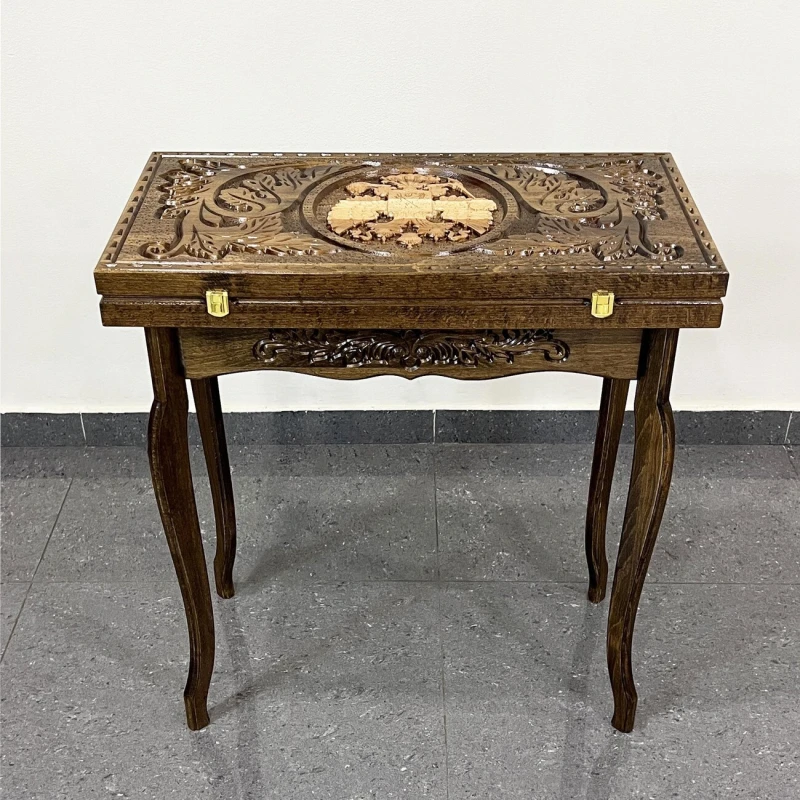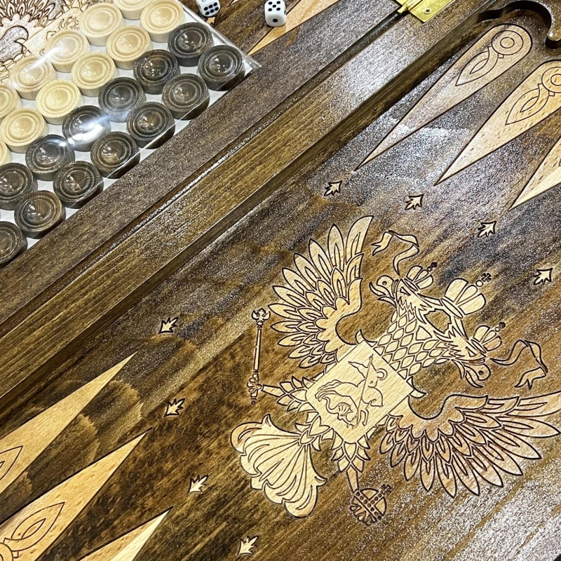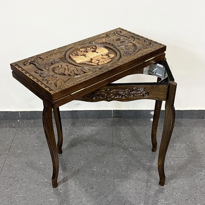 Большой резной ломберный столик для игры в нарды. Ручная работа. Материал стола массив бука. В комплетке игральные кости и фишки для нард. Высота стола 67 см. Размер доски в разложенном виде 60 на 60 см. Размер доски в сложенном виде 60 на 30 см. На лицевой стороне резной рисунок Герба России.