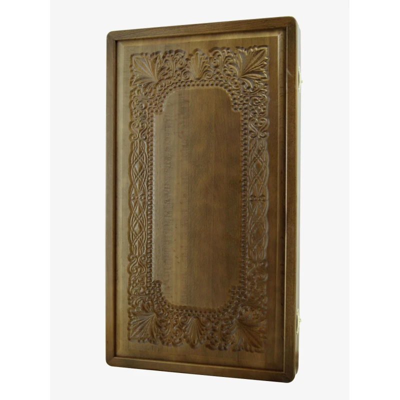 Большие резные нарды из массива бука. Внутри доски есть ячейки для хранения фишек. В комплекте игральные кости и фишки. Упакованны в картонную коробку.
