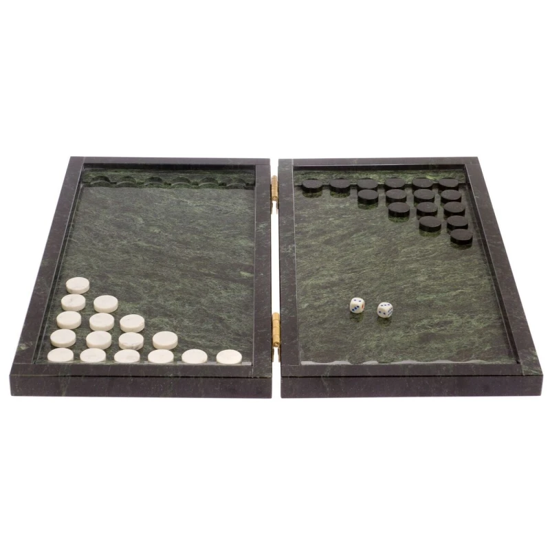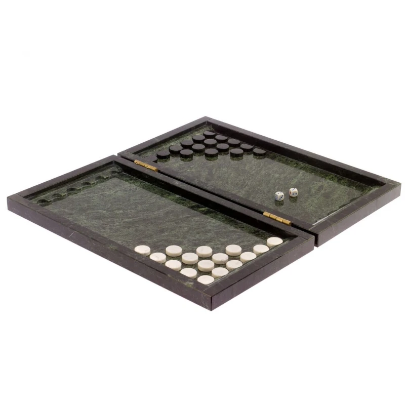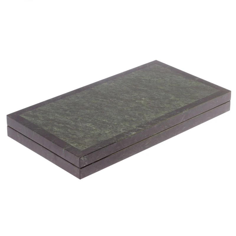 Подарочные нарды из камня Змеевик. Упакованы в транспортировочный кейс из эко кожи. Сделаны в России. Размер доски 48 на 44 см. В комплекте игральные кости и фишки из камня. Подойдут в подарок.