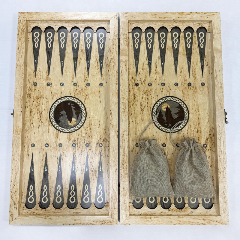 Уникальная тонкая работа, рисунок Волка и внутренний рисунок выполнены в технике маркетри из различных ценных пород дерева и насчитывают более 150 сегментов. Эксклюзивности нардам добавляет инкрустация из перламутра на игровом поле. Углы нард имеют металлические уголки для защиты изделия от повреждений. В комплект к нардам входят фишки по 15 штук светлых и темных, светлые выполнены из карельской березы, темные их тонированного бука, а так же, в комплекте имеются зари 4 шт из арамида. Фишки имеют подклейку из бархата в основании, для предотвращения царапин на игровом поле.