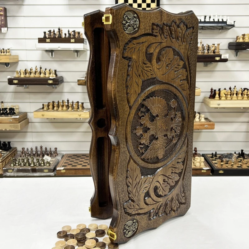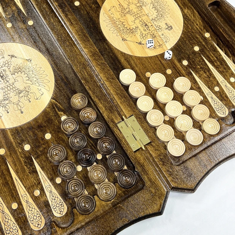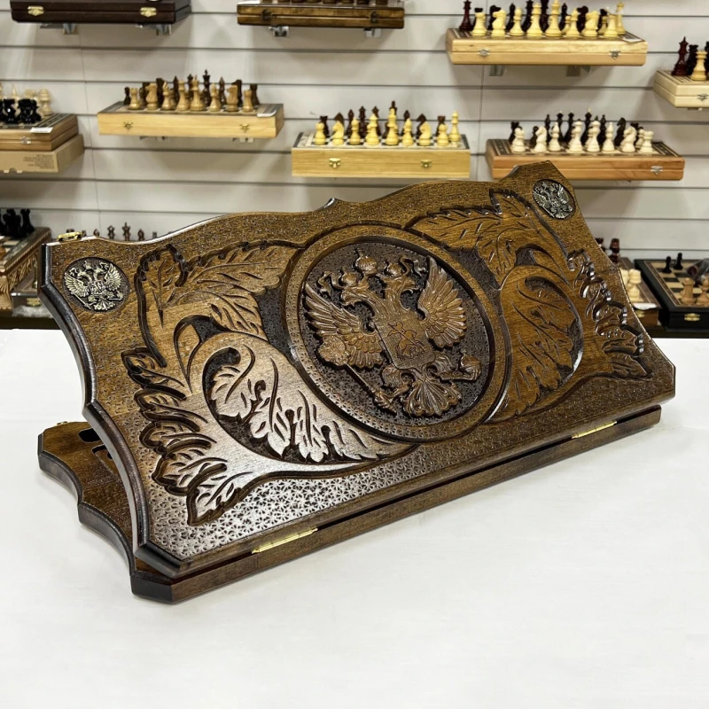 Нарды ручной работы из массива бука с орнаментом Герба РФ.