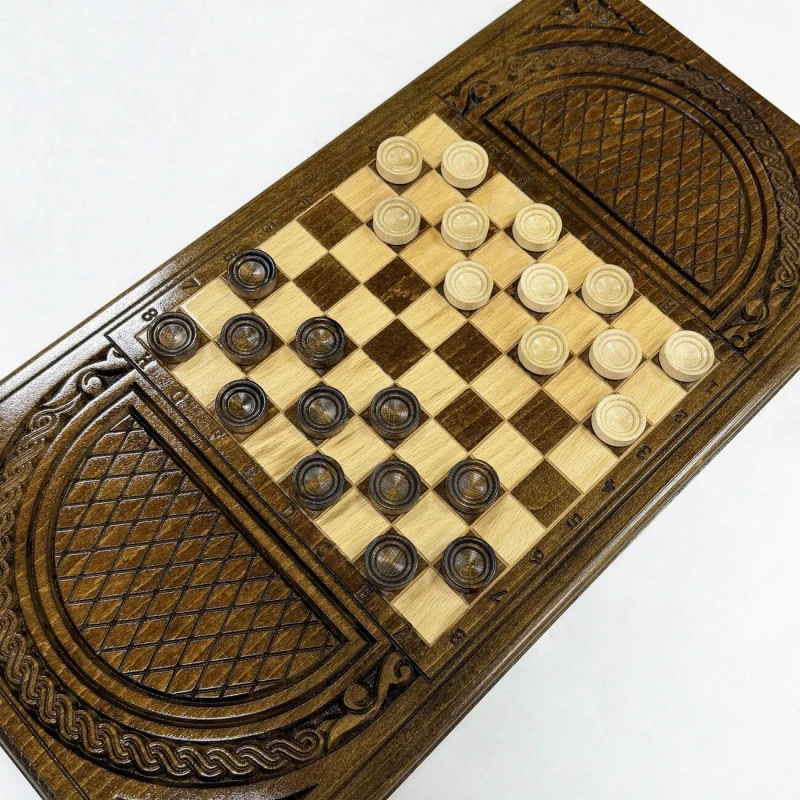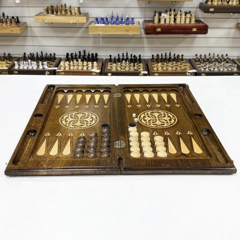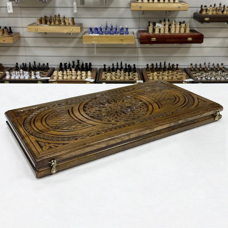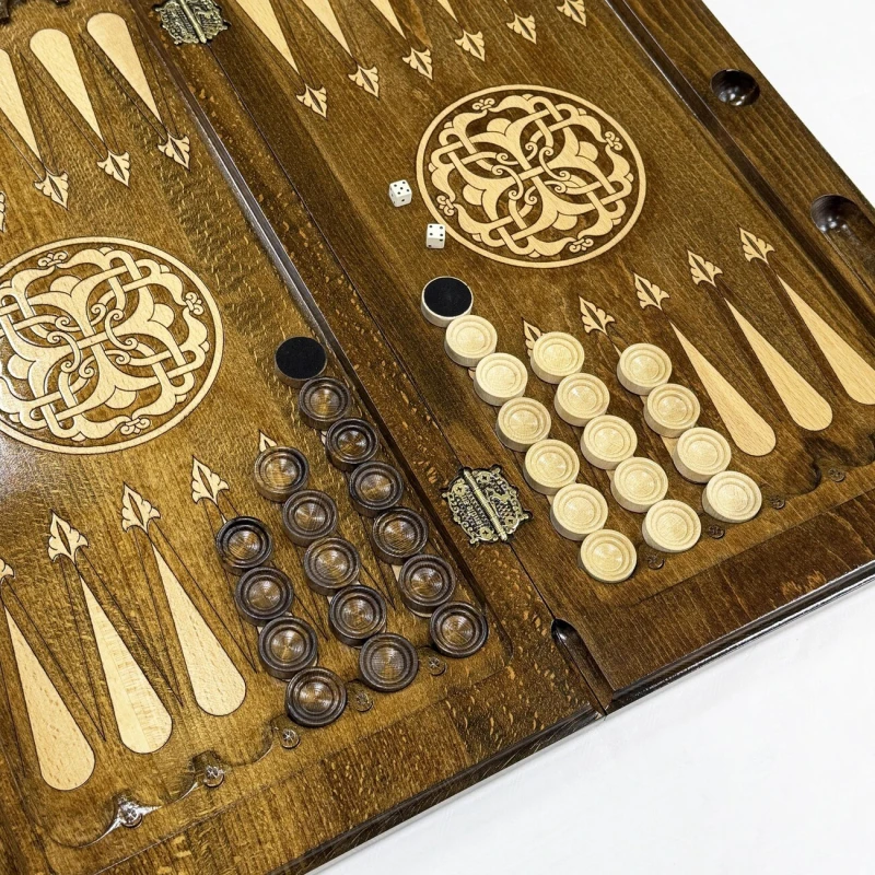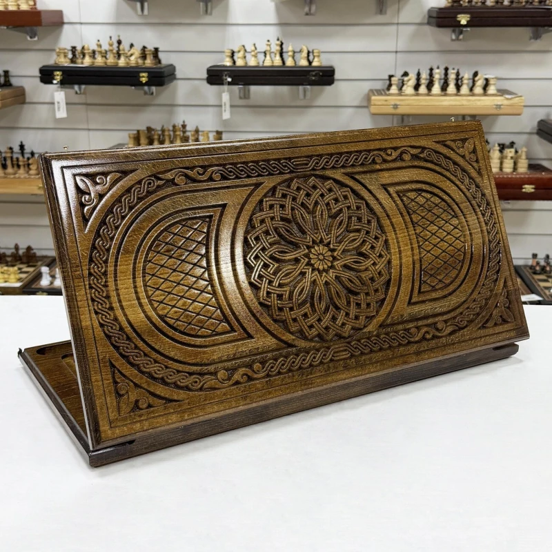 Эксклюзивные нарды, выполненные из массива бука, представляют собой настоящую работу искусства ручной работы. Длина 60 см делает их идеальными для комфортной игры как дома, так и в поездках. Каждая доска уникальна благодаря натуральной текстуре дерева, а тщательная обработка и лаковая отделка придают нардам элегантный вид и защиту от износа. На внешней стороне -изображение рисунка Орнамент. На обратной стороне -поле для шашек. В комплекте идут фишки и кости. Игра на таких нардах станет не только увлекательным времяпрепровождением, но и эстетическим наслаждением, благодаря гармонии формы и материала.