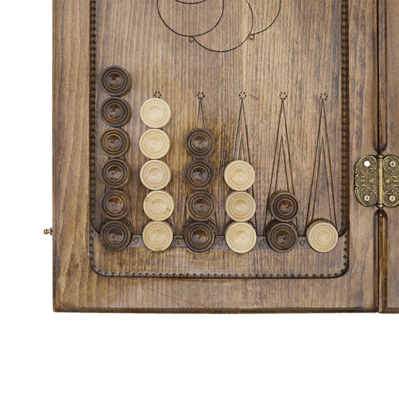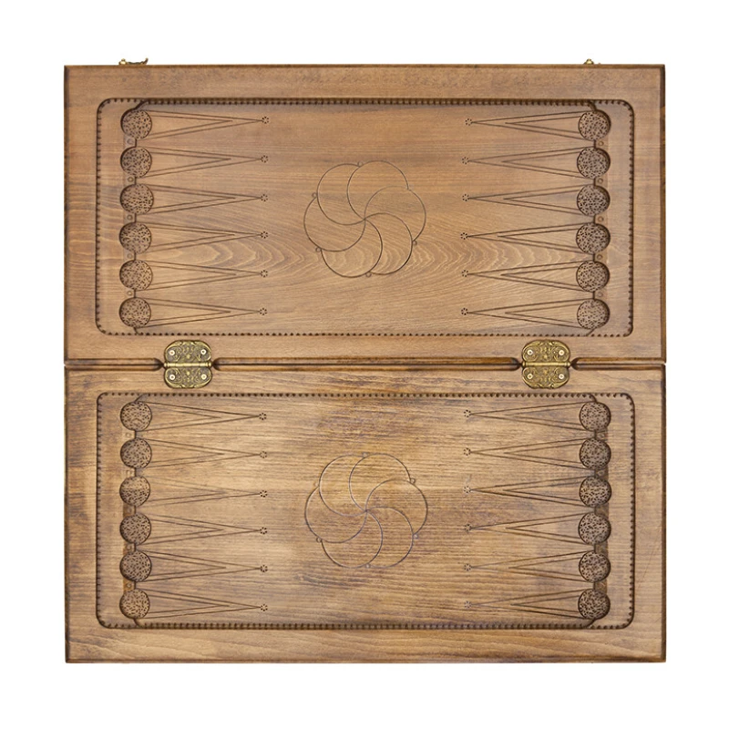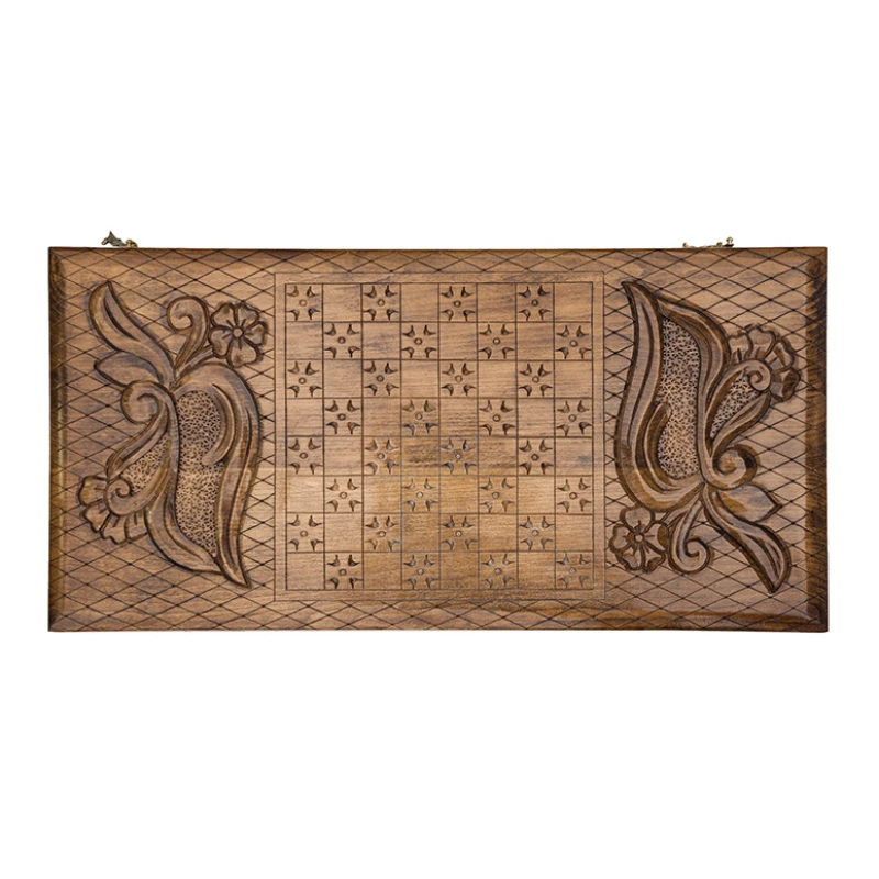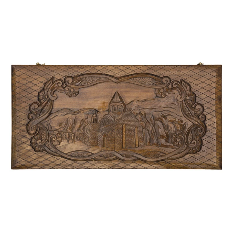 На лицевой стороне вырезано изображение известной горы в Армении, на фоне которой находится монастырь. Отдохнуть от напряжённых партий в нарды поможет шашечное поле на второй створке. Внутри предусмотрены углубления, куда складываются фишки во время игры или при транспортировке. Данное изделие прослужит долгое время и не утратит своей внешней красоты, за счёт использования орехового массива, покрытого несколькими слоями лака.