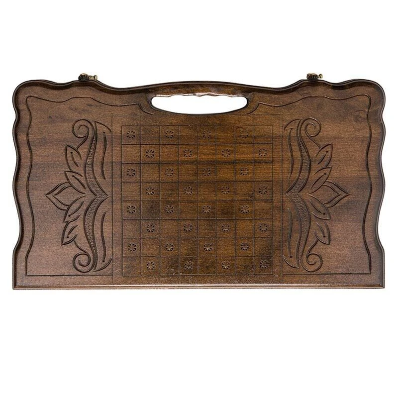 Ореховое дерево было выбрано неслучайно, т.к. оно обладает высокой прочностью, долговечно, хорошо сопротивляется механическим повреждениям. Сверху оно покрыто несколькими слоями лака для улучшения положительных свойств и придания красивого внешнего вида. Комплектные фишки достаточно прочные, чтобы выдерживать скоростные партии, а снизу к ним приклеена ткань, способствующая улучшению скольжения и защищающая от повреждений и царапин доску.