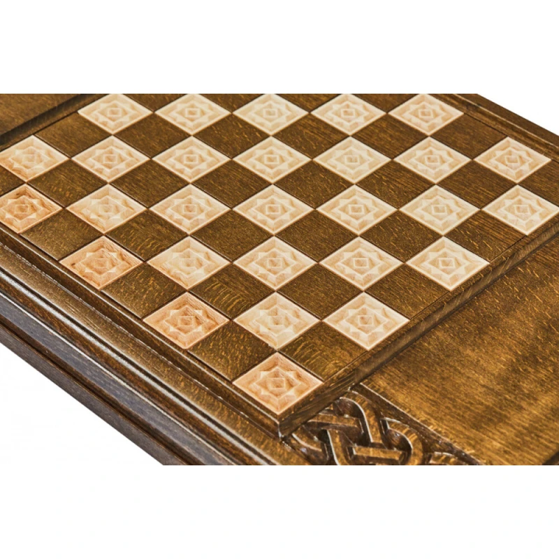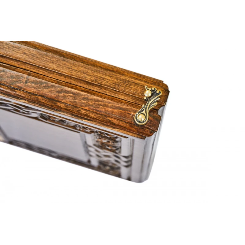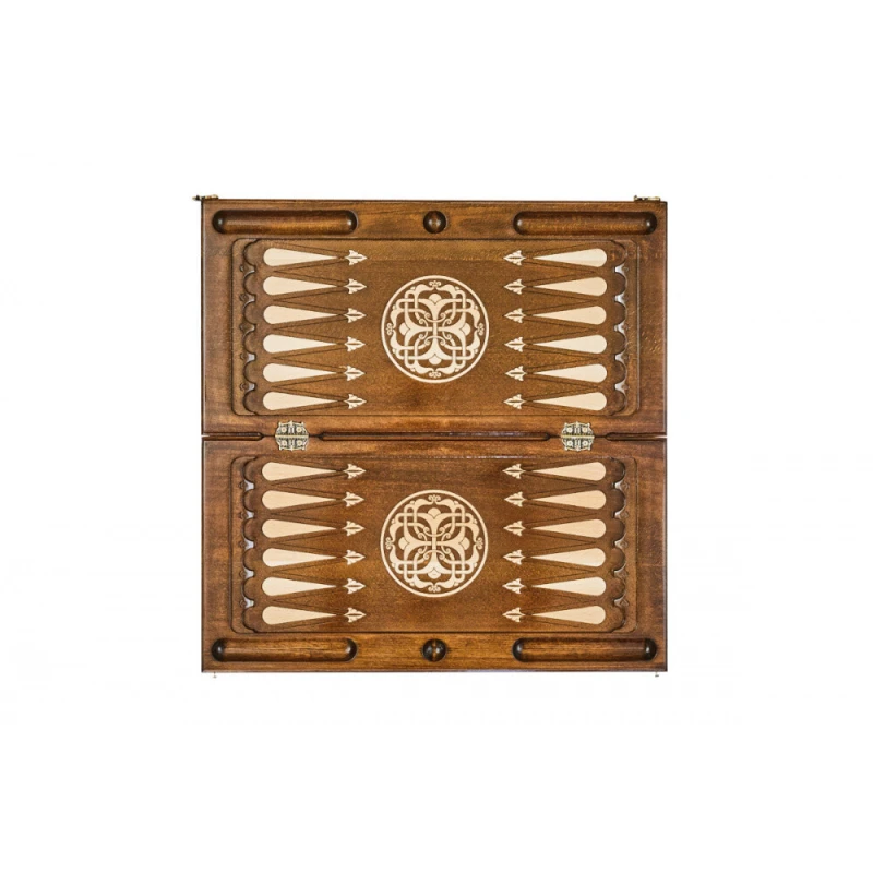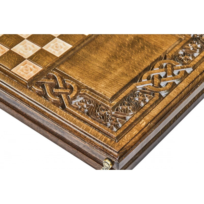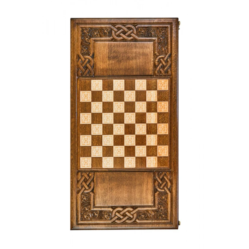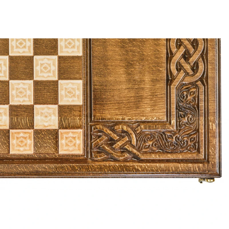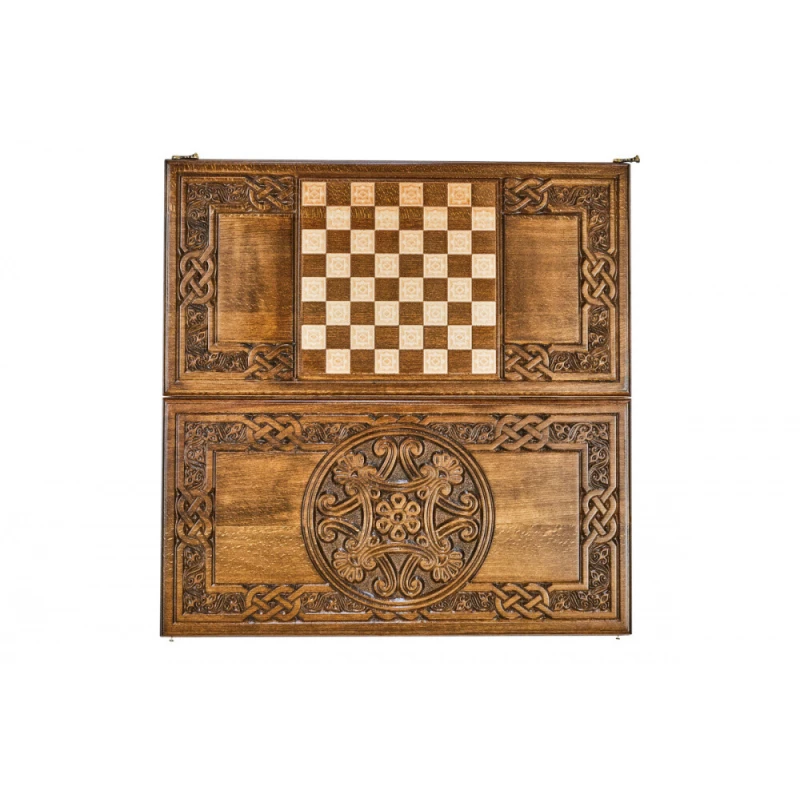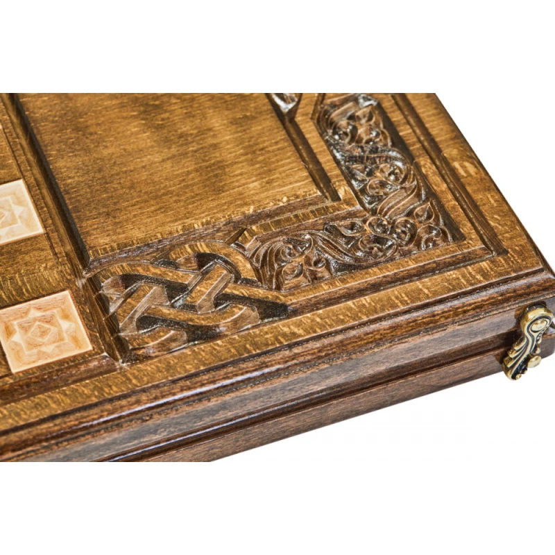 Резные нарды «Армянский Узор-7» - набор классической настольной игры, выполненный в традиционном национальном стиле. Доска выполнена из натуральной буковой древесины и дополнена качественной и износостойкой бронзовой фурнитурой. На оборотной внешней стороне доски нанесено поле для шашек, что делает данное изделие, в сущности, набором 2-в-1. Для предотвращения механических повреждений каждый элемент набора покрыт защитным лаком. Кости и полный набор фишек, необходимых для игр, поставляются в комплекте.