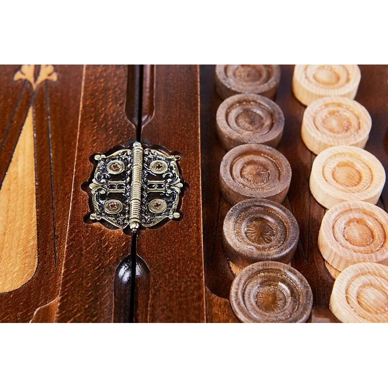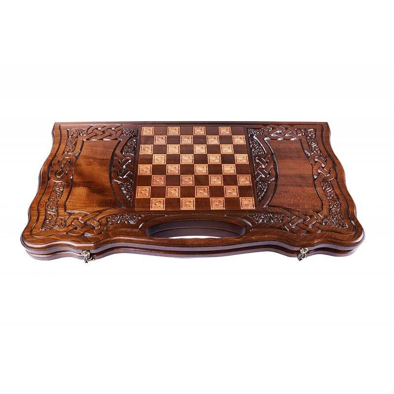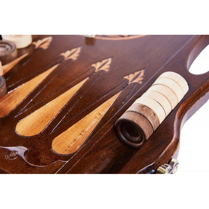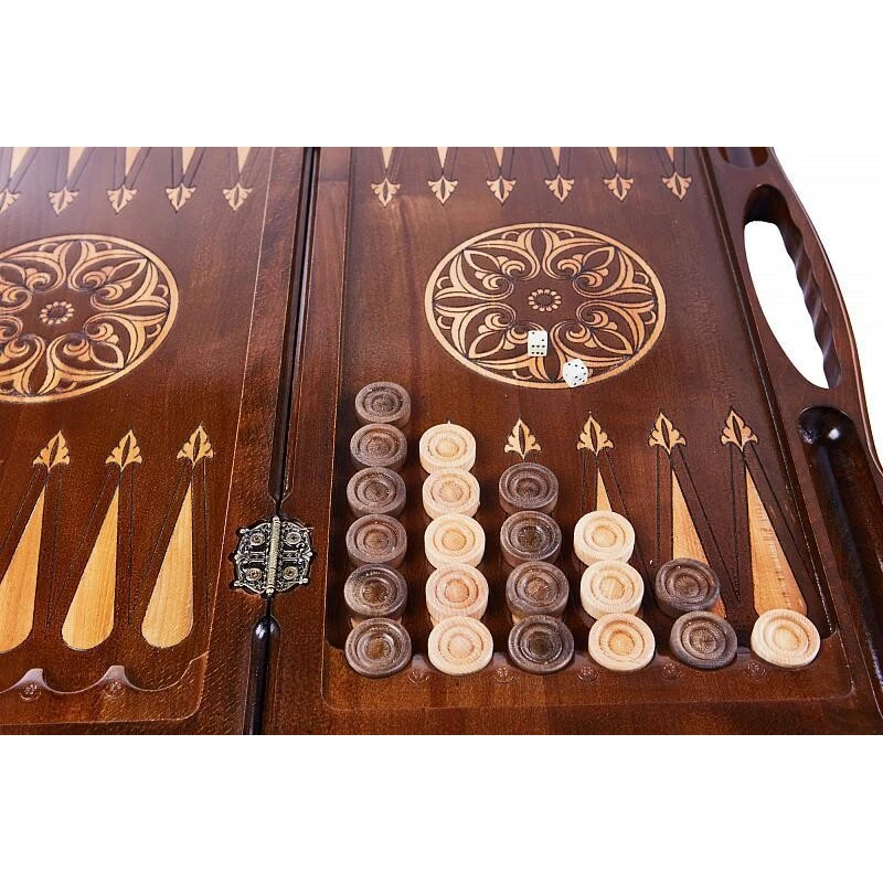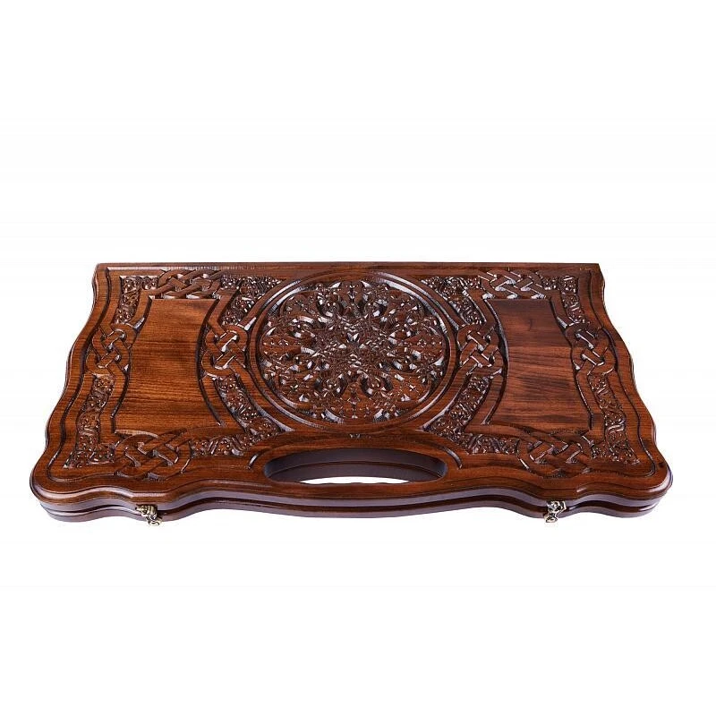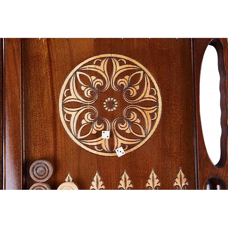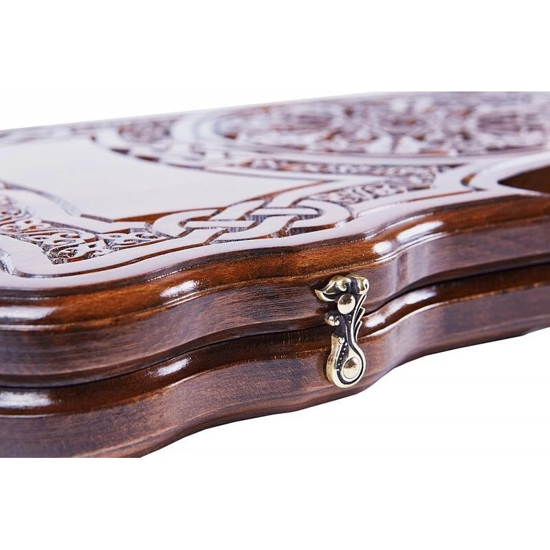 Дизайн резных нард с ручкой «Армянский Узор-9» выполнен в традиционном национальном стиле и полностью отражает в себе основные элементы фольклора Армении. Изделие, выполненное из натуральной буковой древесины, впечатляет проработанностью каждой детали. Скрепляется доска надежными нержавеющими петлями, а для удобства транспортировки в ней предусмотрена удобная ручка. Каждый элемент изделия покрыт защитным лаком. Также на внешней оборотной стороне доски нанесено поле для игры в шашки. Комплект фишек, необходимый для этого, а также пара костей идут в комплекте.