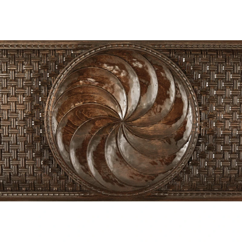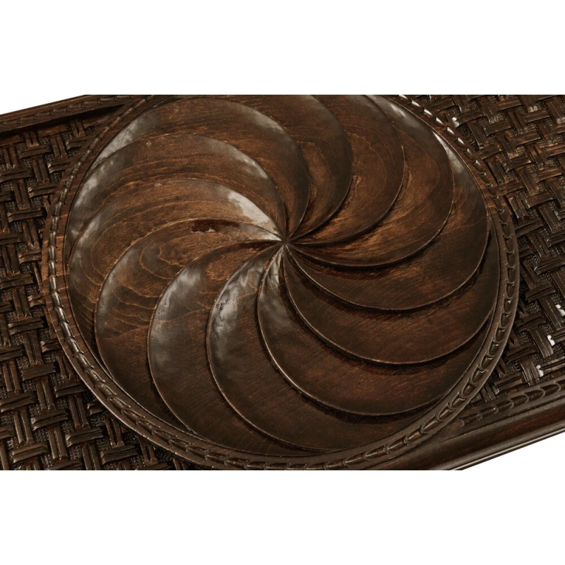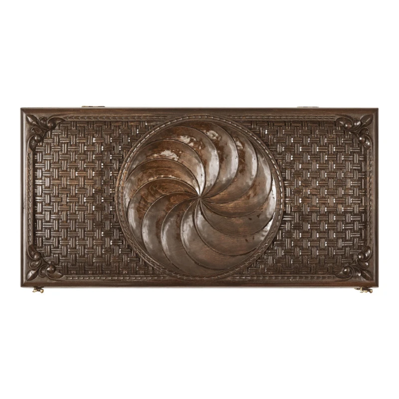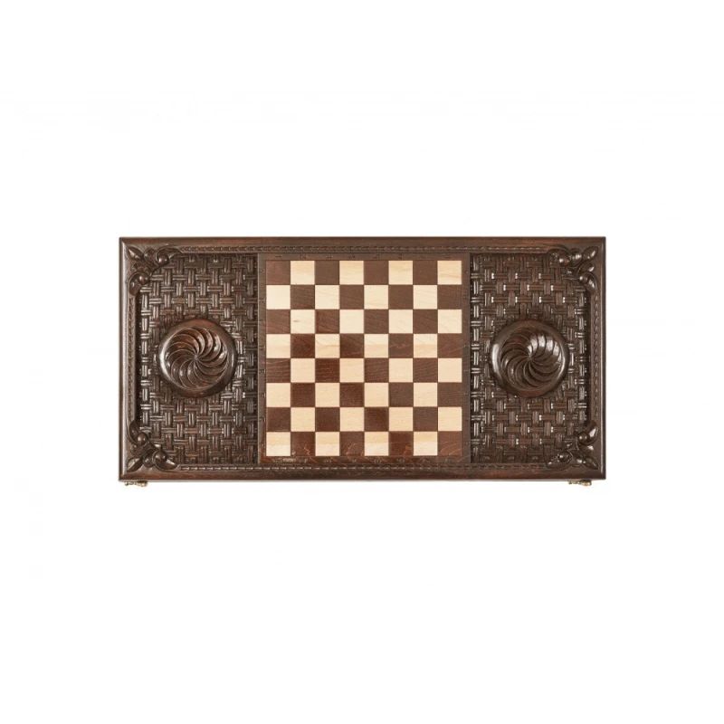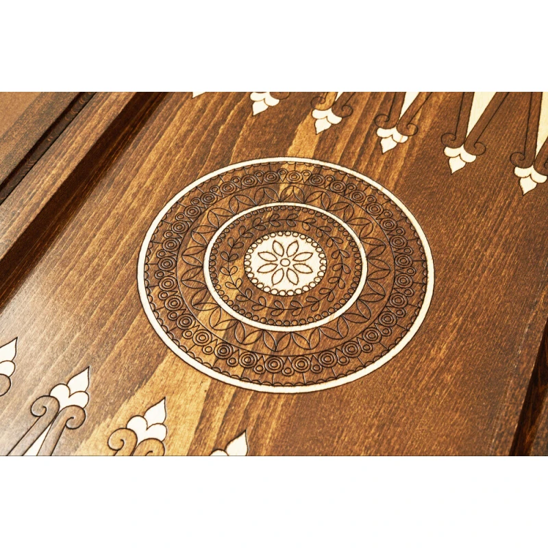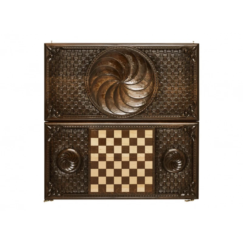 Игровая поверхность должна быть не только практичной, но и красивой, и именно это сочетают в себе нарды резные «Бесконечность». Армянский мастер Саркис Петросян известен своим уникальным подходом к изготовлению, поэтому доска не прямоугольная, а с изысканными закруглёнными гранями. В центре лицевой стороны вырезан круглый символ солнца, который окружён узором в виде веток с листьями. Обратная сторона в середине представляет собой поле для шашек, также окаймлённое интересной резьбой.