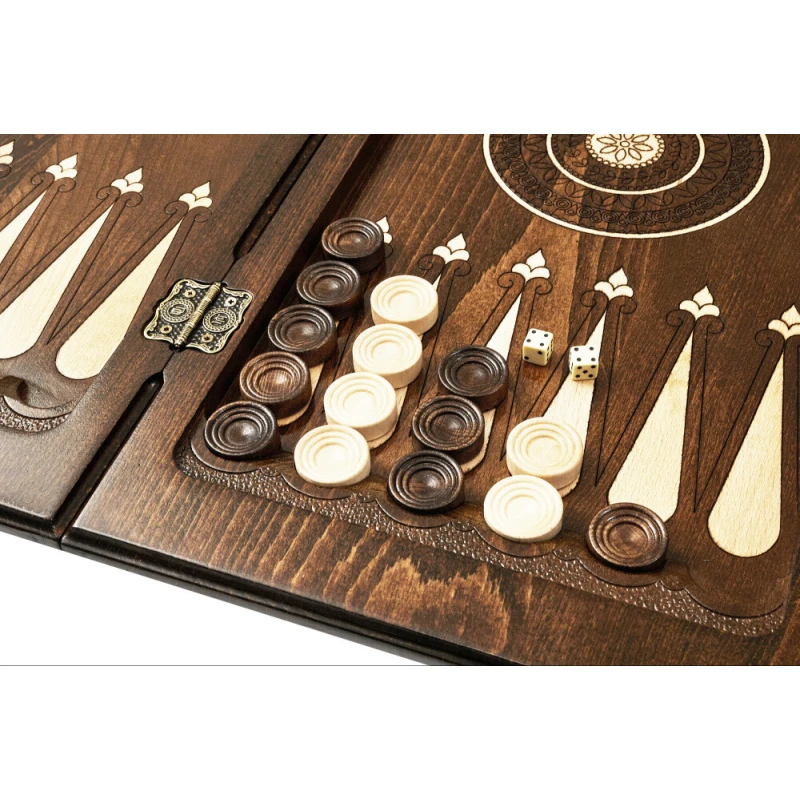 За прочность доски отвечает орех, который точно выдержит длительные активные партии. Кроме того, он обладает отличным показателем долговечности, поэтому изделие прослужит длительное время. Бронзовые петли и крючки выдерживают многочисленные открывания-закрывания. В итоге покупатель приобретает изделие, которым сможет долго пользоваться и любоваться его внешней привлекательностью.