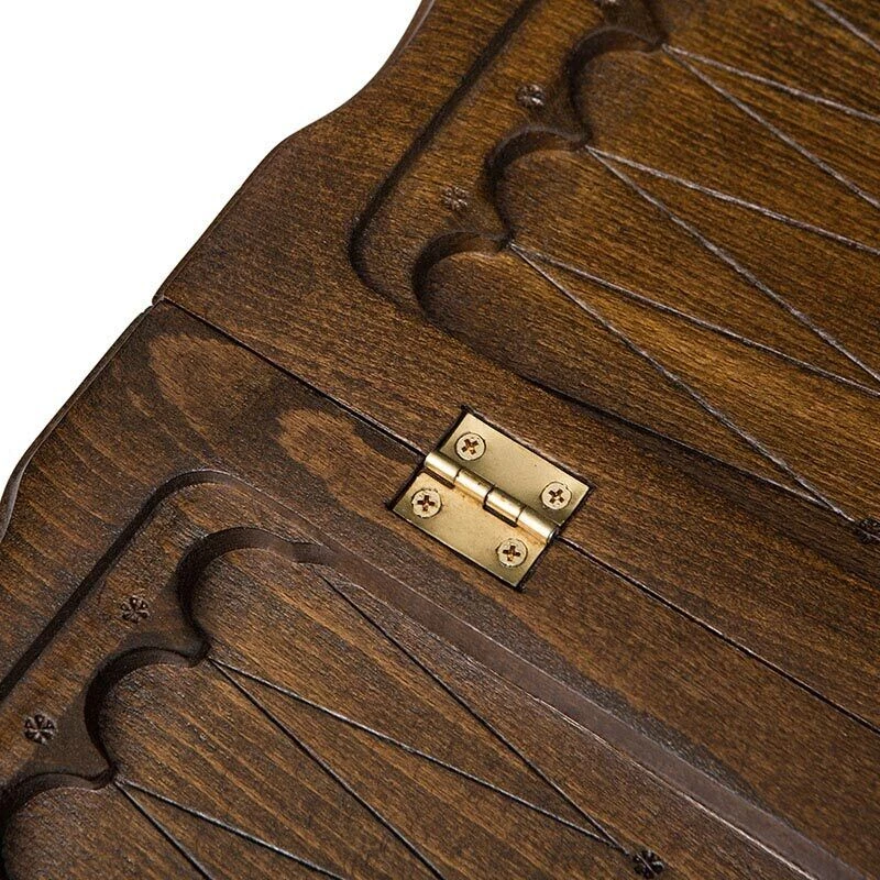 Для доски использована древесина орешины, что гарантирует долгий срок службы, даже при ежедневной игре. К тому же, она отличается изысканной фактурой, что придает готовому изделию уникальности и престижности. Для сцепления створок используются бронзовые петли, а закрываются они на специальные крючки из аналогичного материала. Фишки также прочные, а чтобы случайно не сломать их или доску при игре, снизу предусмотрена прокладка из ткани.
