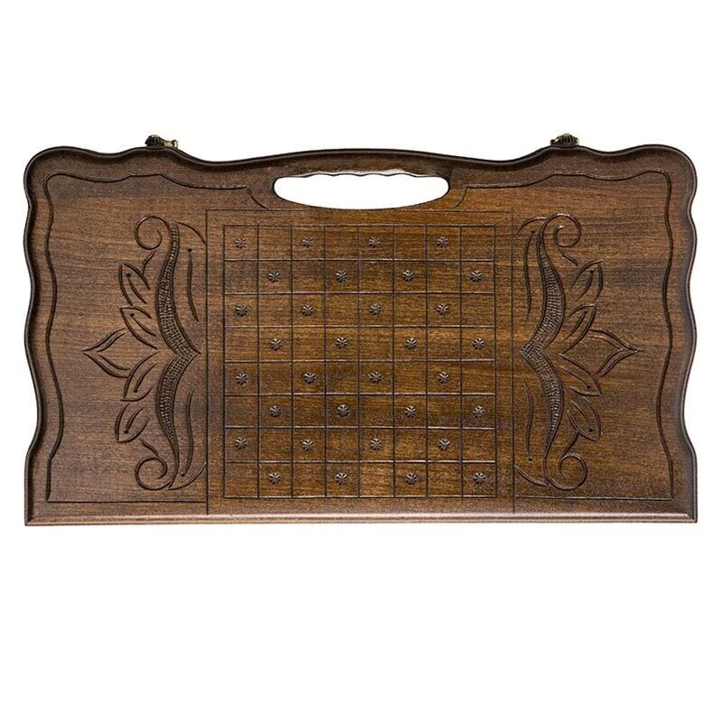 У доски вырезана ручка, которая значительно облегчает переноска и смотрится гармонично. Для защиты от грязи и механических повреждений при транспортировке можно использовать чехол из толстой ткани. В комплекте есть фишки и игральные камни – можно приступить к игре сразу после покупки. Все это складывается внутрь доски, створки закрываются на крючки, доска упаковывается в чехол и так может храниться очень долгое время.