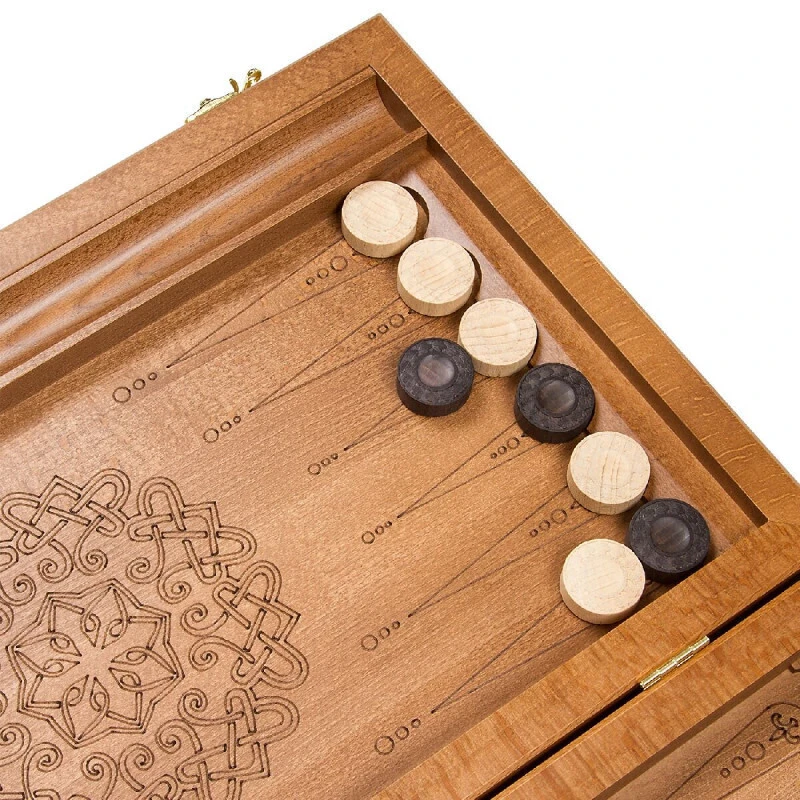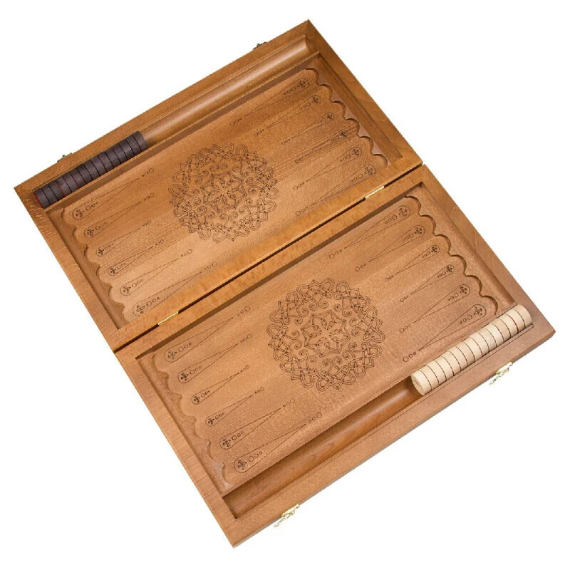 Деревянные нарды из массива бука. В комплекте игральные кости, фишки для нард. Внутри доски есть дом для хранения фишек. Размер доски в разложенном виде 51 на 58 см.