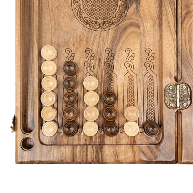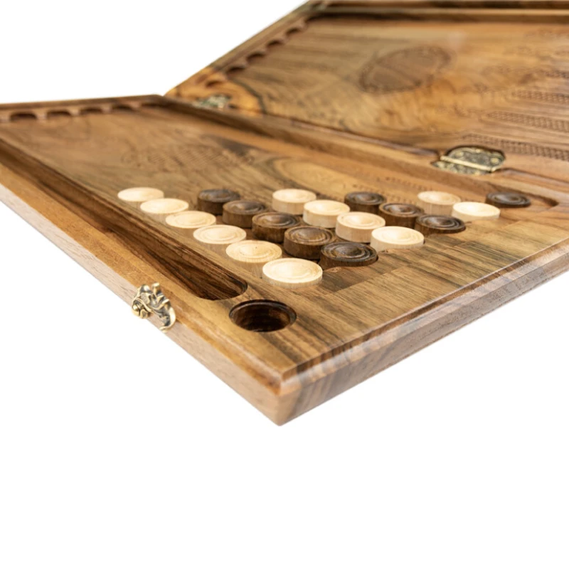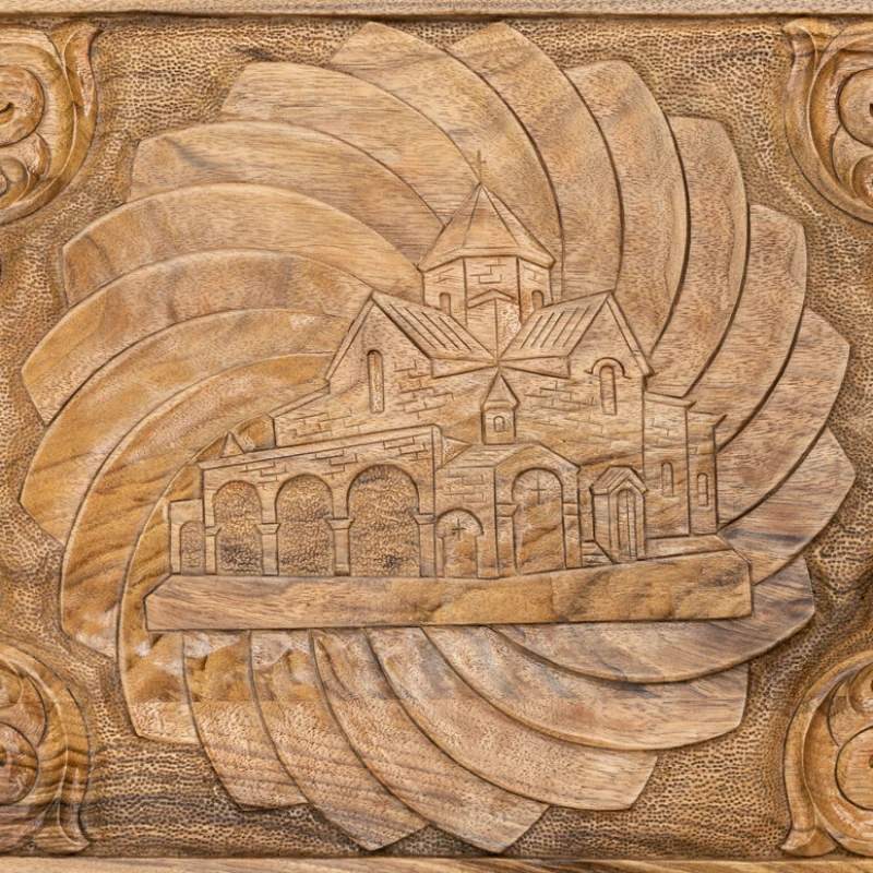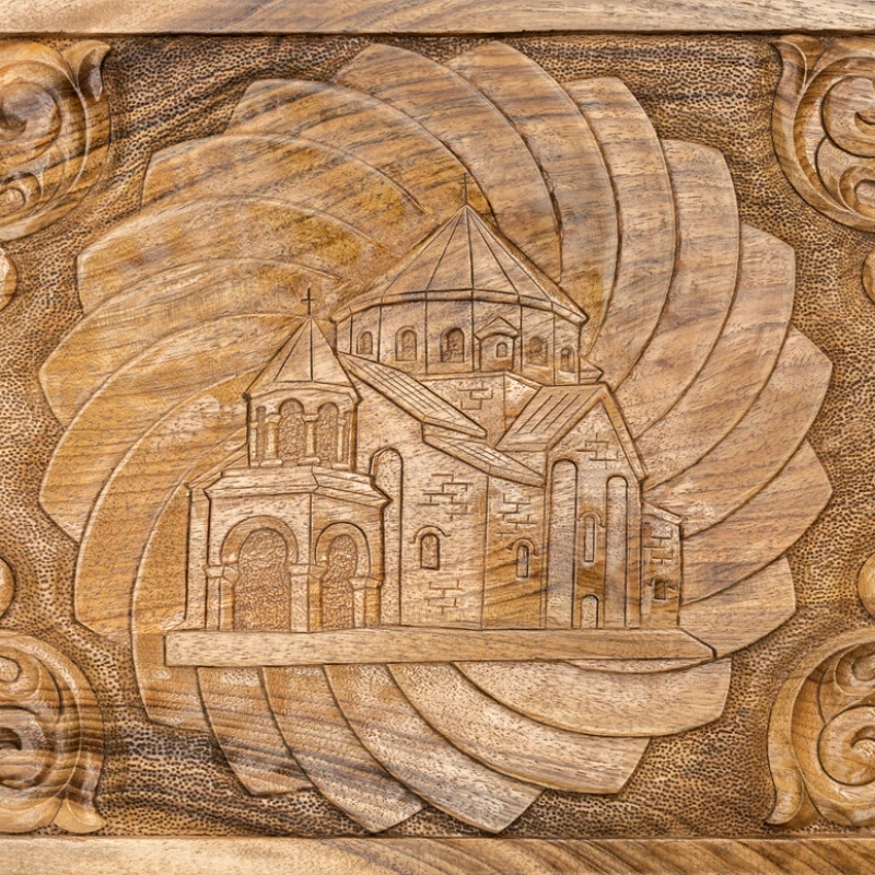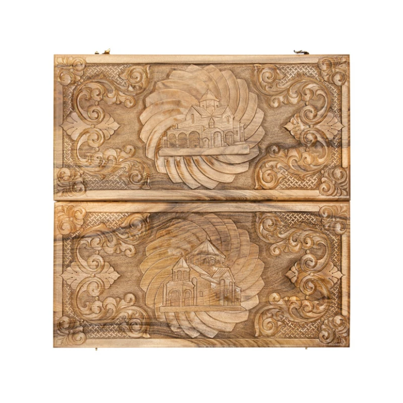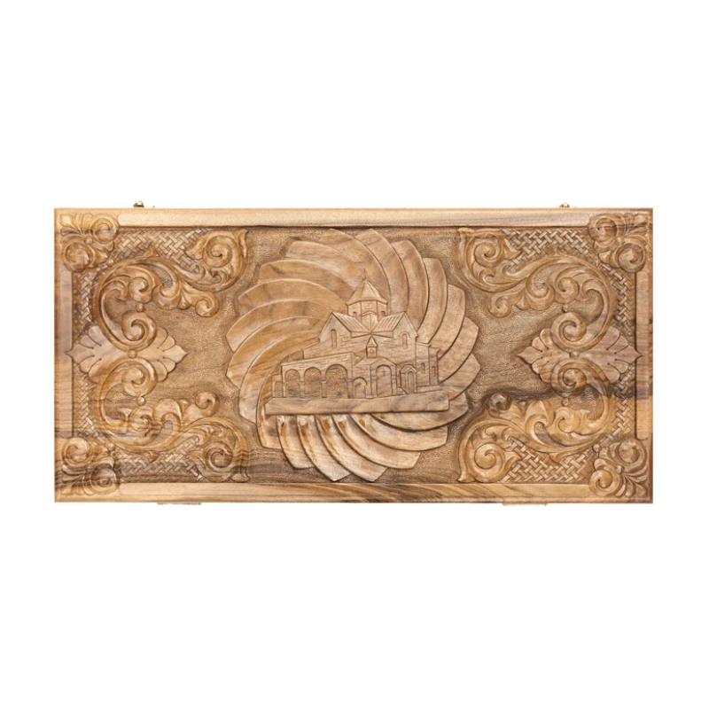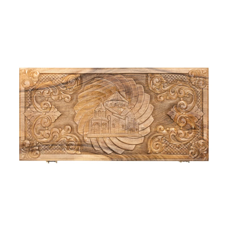 Игровая поверхность не обязательно должна быть простым куском дерева, что наглядно видно в нардах резных «Церковь» от известного армянского мастера Давида Мхитаряна. В этом случае он вдохновлялся видом старинной церкви, которую и вырезал на лицевой створке. Она окружена красивыми рисунками и узорами. Причём всё это выполняется ручным способом, поэтому это уникальная в своём роде доска.