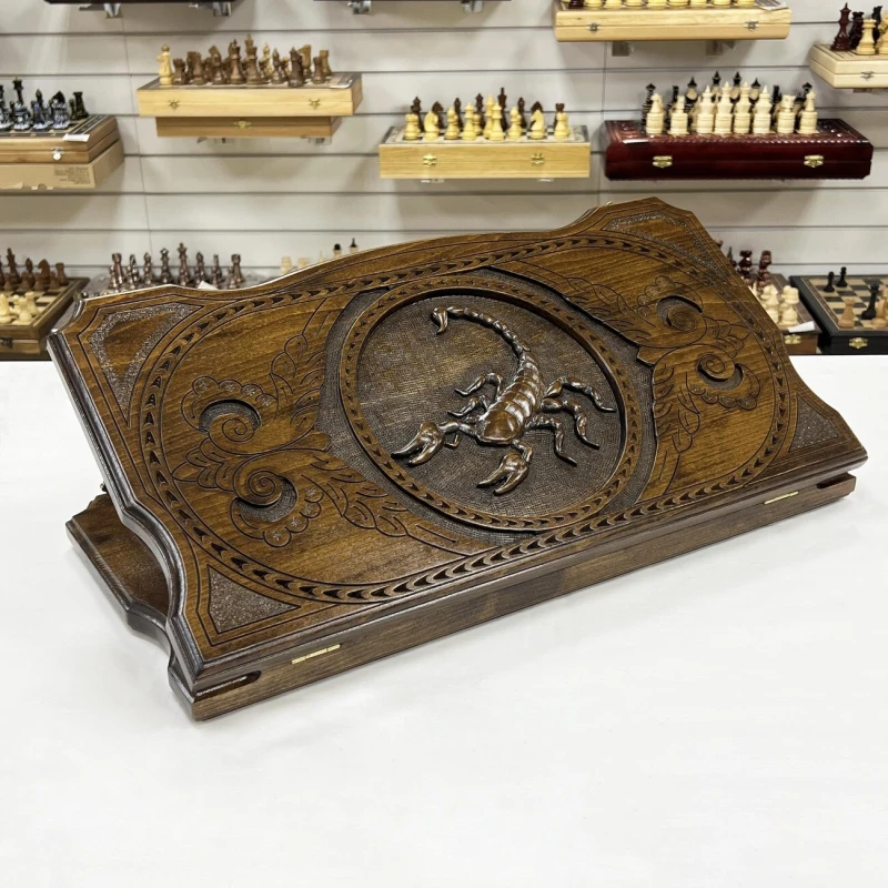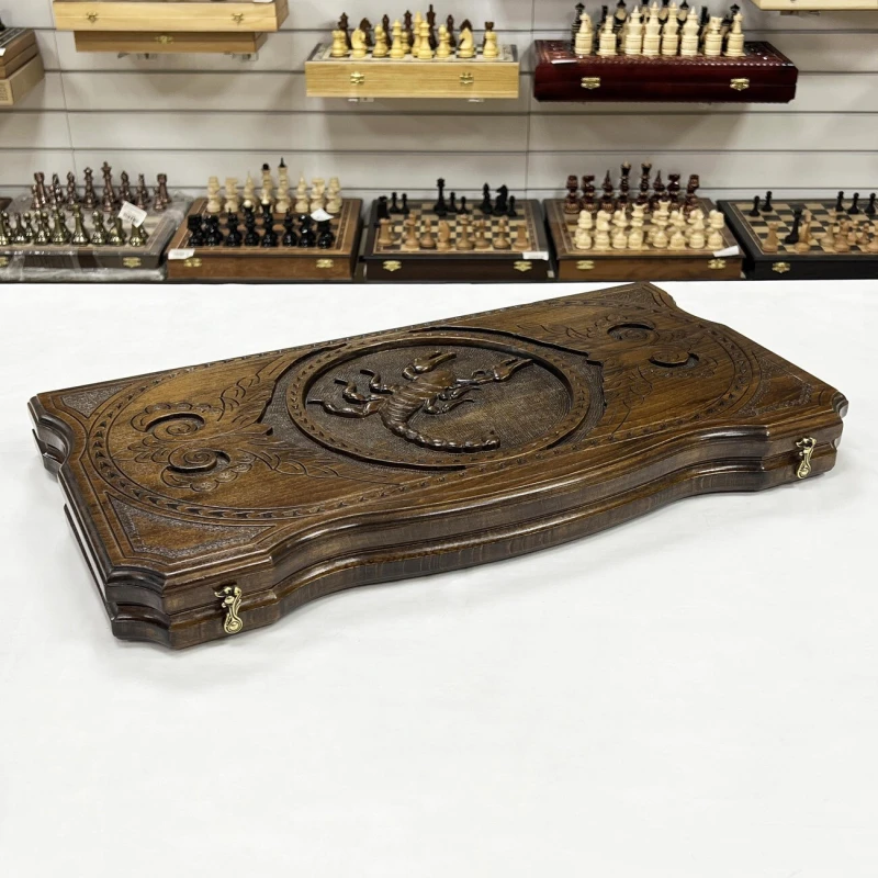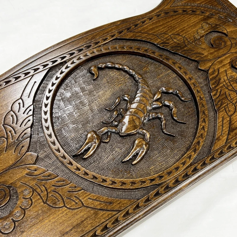 Большие деревянные нарды ручной работы из массива бука. Размер доски в разложенном виде 60 на 60 см. Размер доски в сложенном виде 60 на 30 см. Нарды украшены резным рисунком Скорпиона. Эти нарды станут отличным подарком для любителей качественных и красивых нард ручной работы.