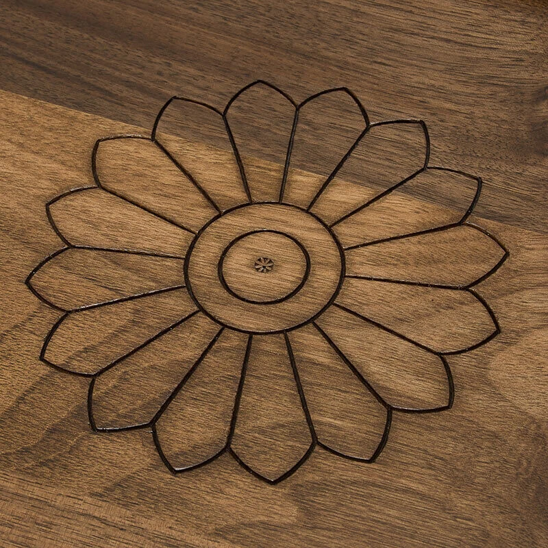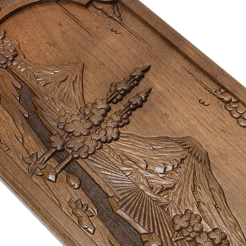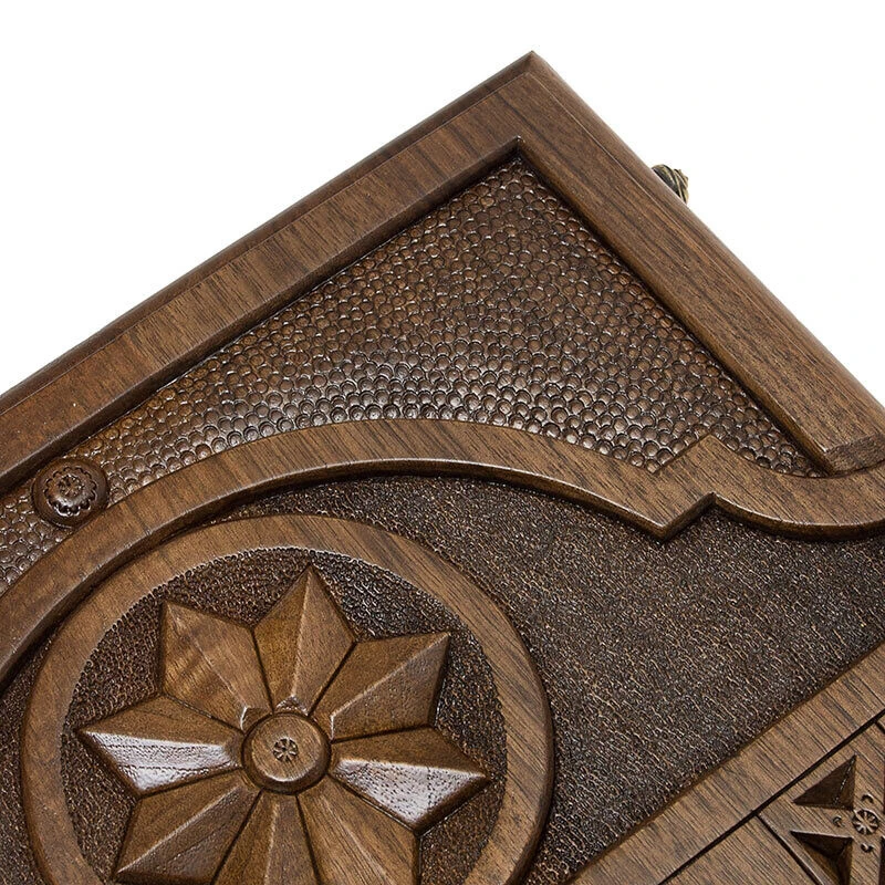 На лицевой поверхности вырезано целое произведение – Долина, на фоне Гор и с растущими деревьями. Смотрится это привлекательно, прям так и хочется отправиться на отдых. На задней поверхности есть поле для игры в шашки и красивые восьмигранные звезды. Изнутри, в центральной части расположился радиальный узор, а каждая ячейка подчеркивается необычной резьбой. Петли оформлены с использованием эмблемы мастера в виде буквы H. Предусмотрен защитный чехол из мягкой ткани, спасающий при транспортировке или длительном хранении.
