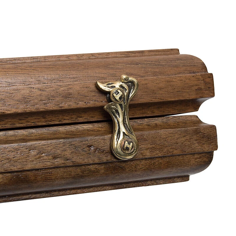 Среди всех материалов, мастер отдал предпочтение именно буку, благодаря его основным преимуществам. Он обладает амортизирующей структурой, которая спасает в случае ударов или падения, конечно в разумных пределах. О деформациях из-за влажности и случайных проливов также можно не беспокоиться, так как здесь поверхности покрыты лаком. Он придает изысканного блеска, подчеркивающего высокий класс продукта. Срок эксплуатации производителем не указывается, так как его нет – при хорошем обращении может прослужить и 10 лет, а может и больше. Петли надежные, что обеспечивается мягкостью бронзы. Из нее же сделаны и крючки.