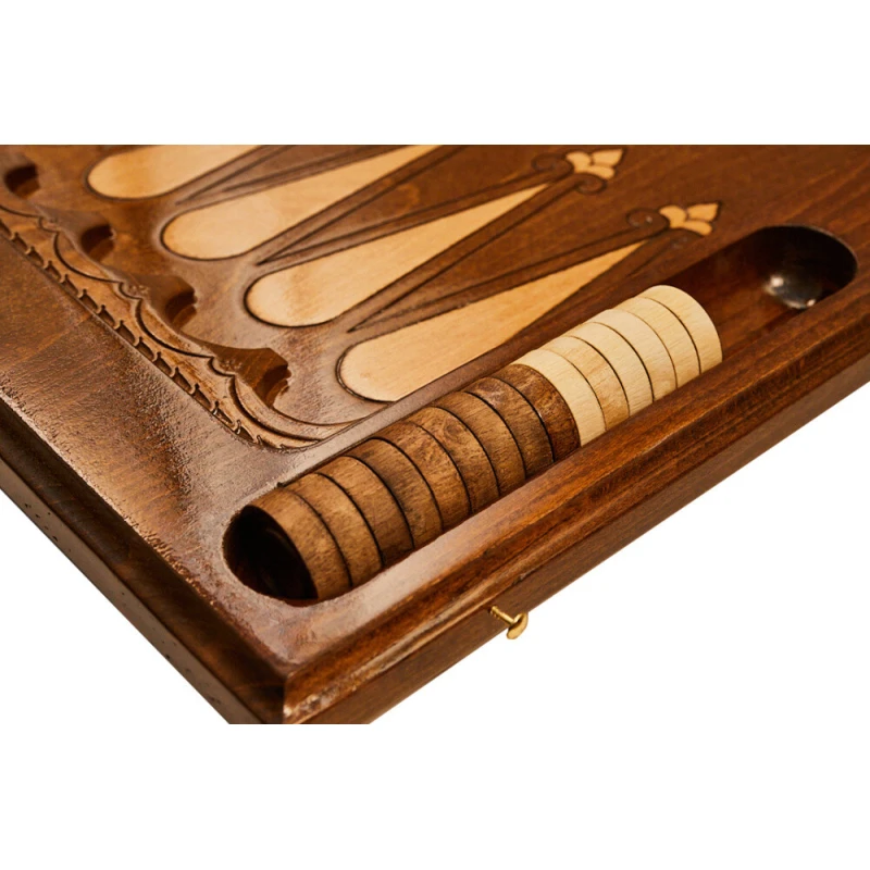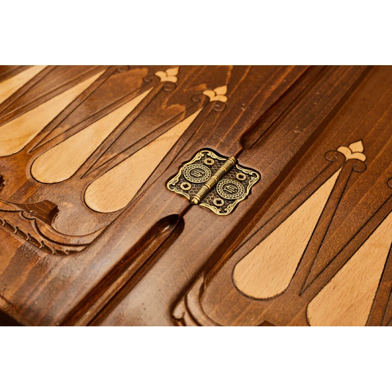 Изготовлена игровая доска из бука, известного своей высокой прочностью и длительным сроком службы. Для улучшения физических характеристик всё покрыто слоем лака. Для скрепления используются петли и крючки из металла. Чтобы не повредить поверхность, комплектные фишки снабжены мягкой подложкой.