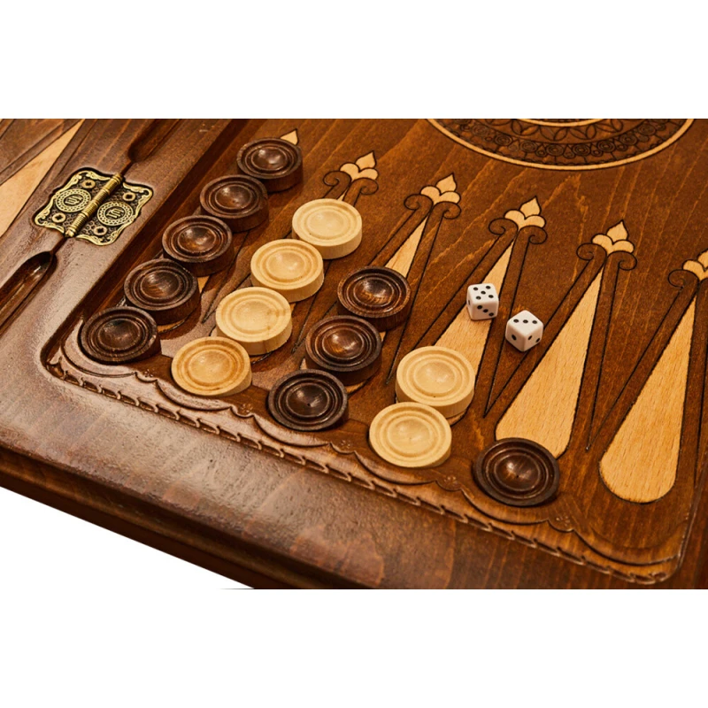 Именно долина Арарата встречает на лицевой части игровой доски, украшенная со всех сторон разнообразными узорами. С обратной стороны находится поле для шашек, для которых фишки уже есть в комплекте. Внутри оформление ничуть не уступает внешнему. Центральная часть расписана красивым узором, по бокам расположены специальные углубления для фишек. Всё это делает игру удобнее и приятнее.