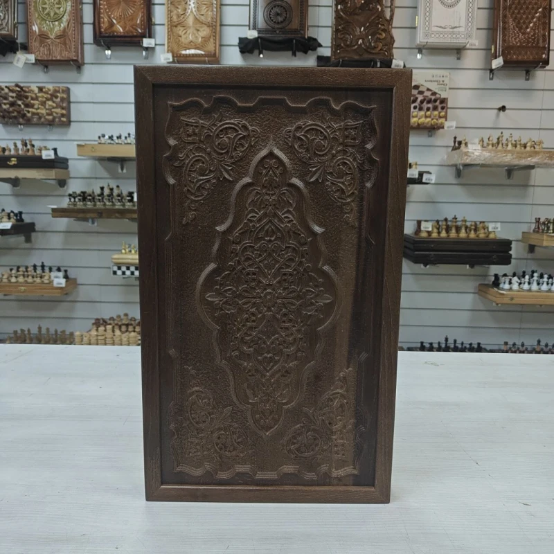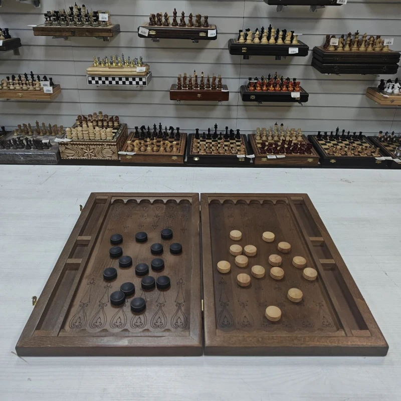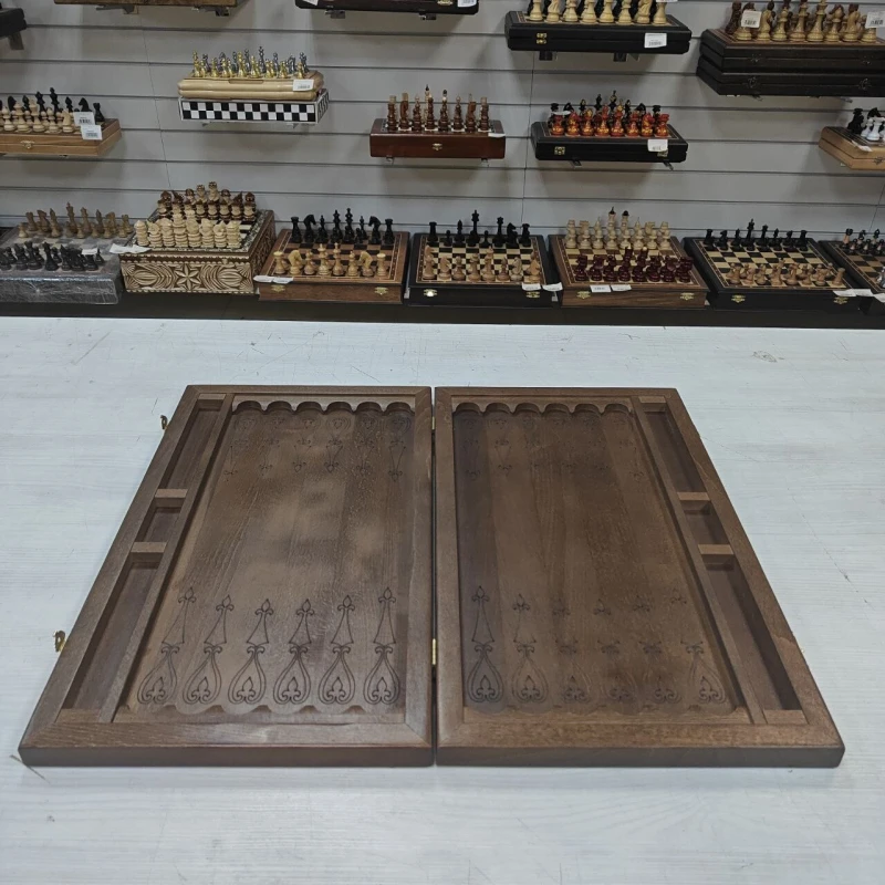 Нарды резные выполнены из массива бука. Размер 50х58 см. На лицевой стороне нард резной узор. Имеются ячейки для безопасного хранения фишек. диаметр фишек 2.7 см, фишки без подклейки. Подойдут в подарок для взрослых и детей. Сделаны в России.
