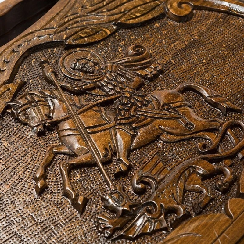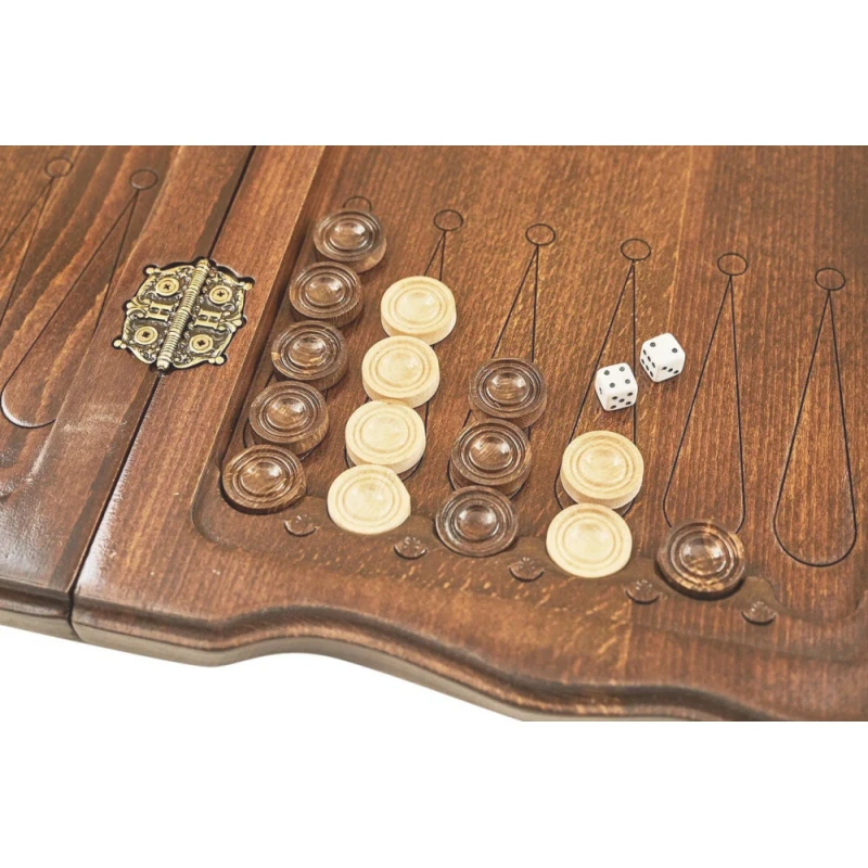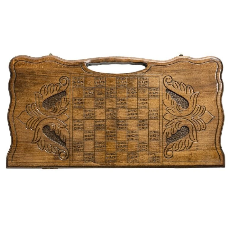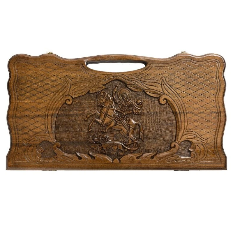 Также на игровой доске предусмотрено поле для шашек, что позволяет расширить ассортимент игр. Размер нард составляет 61 см, а вес - 4.2 кг, что делает их очень удобными для игры, и понравится людям которые не любят настольные игры маленьких размеров. Нарды резные "Георгий Победоносец" - это отличный выбор для любителей настольных игр, которые ценят качество и стильный дизайн.