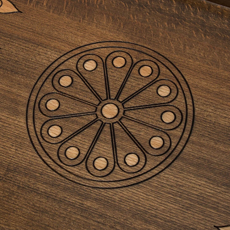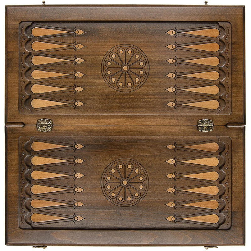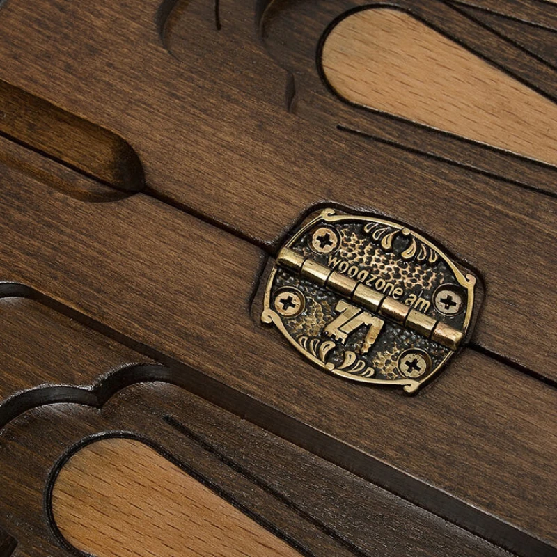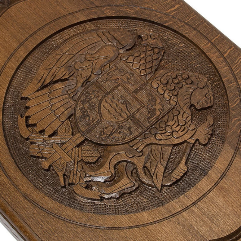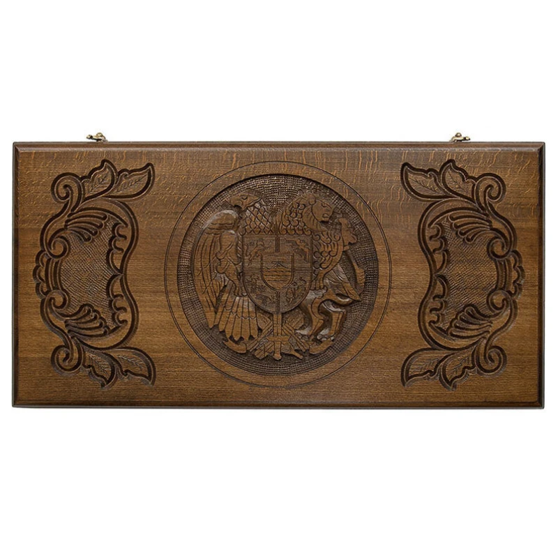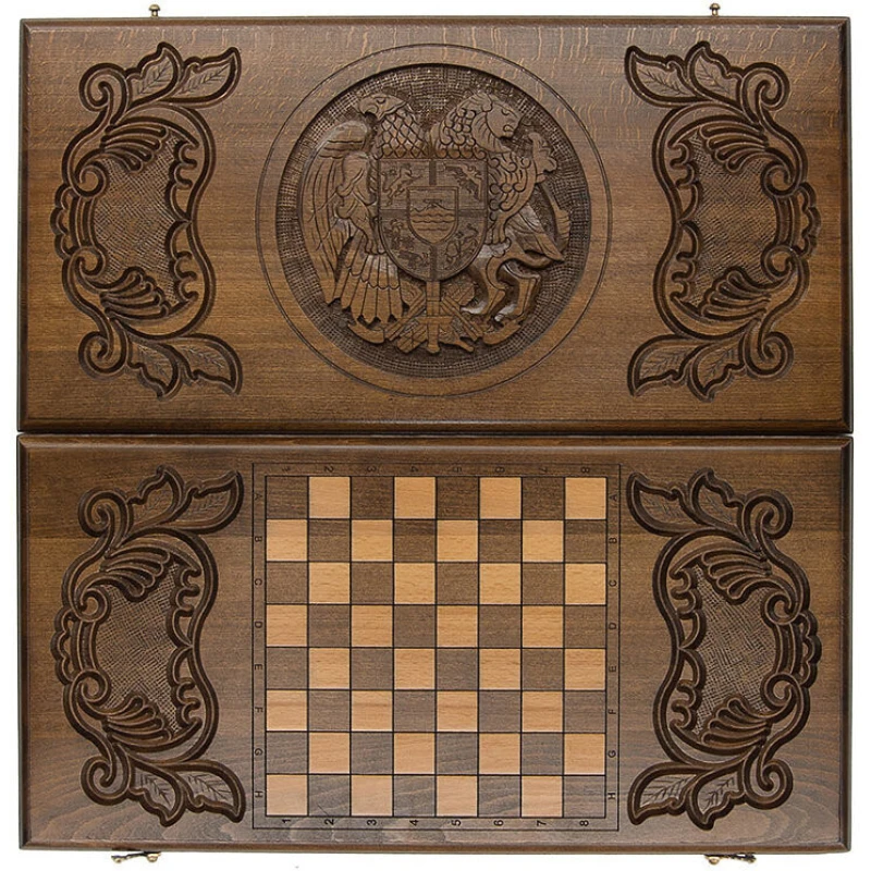 Представленный набор больших нардов изготовлен частным мастером из Армении Варданом Закаряном. Главный элемент резной отделки крышки короба – геральдический символ Армении, давший название этому образцу. Герб представляет собой многочастный щит с эмблемами всех царских родов, правивших когда-то армянскими государствами. Этот щит держат орел и тигр. Изображение помещено в круглую рамку в центре крышки. По сторонам от герба расположены в зеркальном отображении орнаментальные композиции с растительными мотивами. На другой части внешней стороны короба нанесена разметка для игры в шашки. Комплект содержит две кости и 32 фишки для обеих игр данного набора. Для максимальной сохранности изделия в комплект входит практичный чехол из прочной ткани темного цвета.