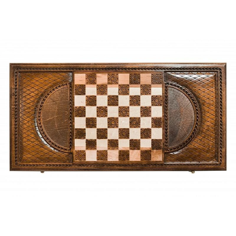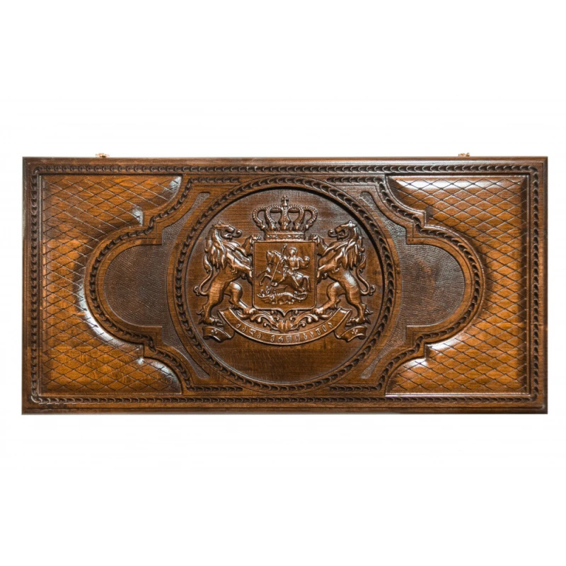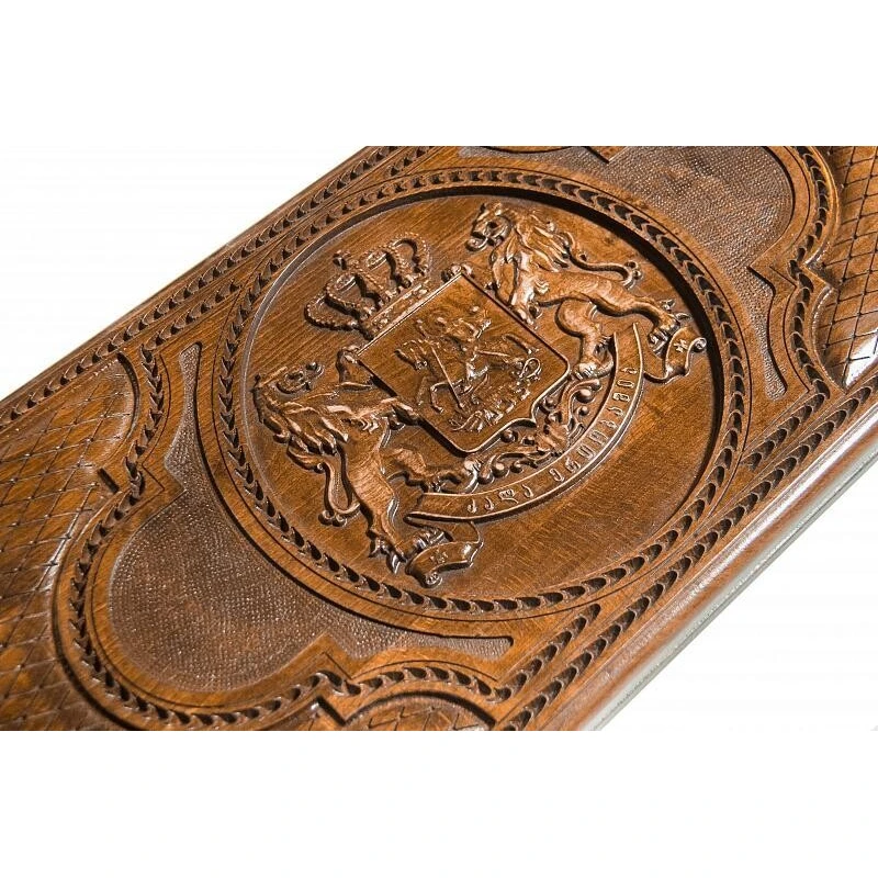 Нарды резные Герб Грузии", выполненные из натуральной буковой древесины талантливым армянским мастером Давидом Мхитаряном – прекрасный подарочный вариант классической настольной игры. Обладающий великолепным внешним видом, такой набор порадует любого поклонника данного развлечения. Для большей износостойкости изделие покрыто защитным лаком. Также долговечность доске, украшенной резным гербом Грузии, обеспечивает качественная медная фурнитура. На задней крышке доски нанесено шахматное поле, что позволяет использовать ее не только для нард, но и для игры в шашки или шахматы. "
